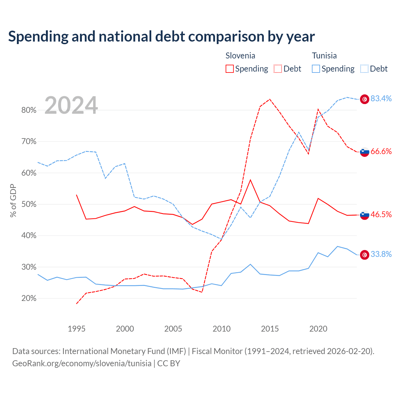 Slovenia has $48.6B in government debt (66.6% of GDP), compared to $42.8B (83.4% of GDP) in Tunisia.