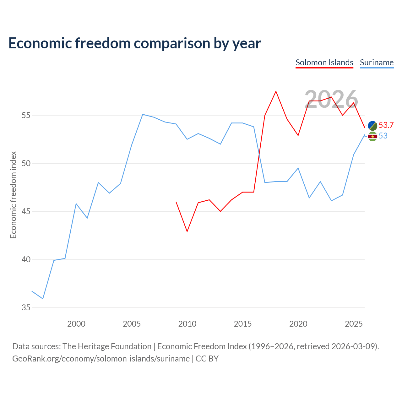 The Economic Freedom Index for the Solomon Islands is 53.7, ranking 137/197, compared to 53 for Suriname, ranking 143/197. The chart above displays a comparison of annual changes in economic freedom indexes.