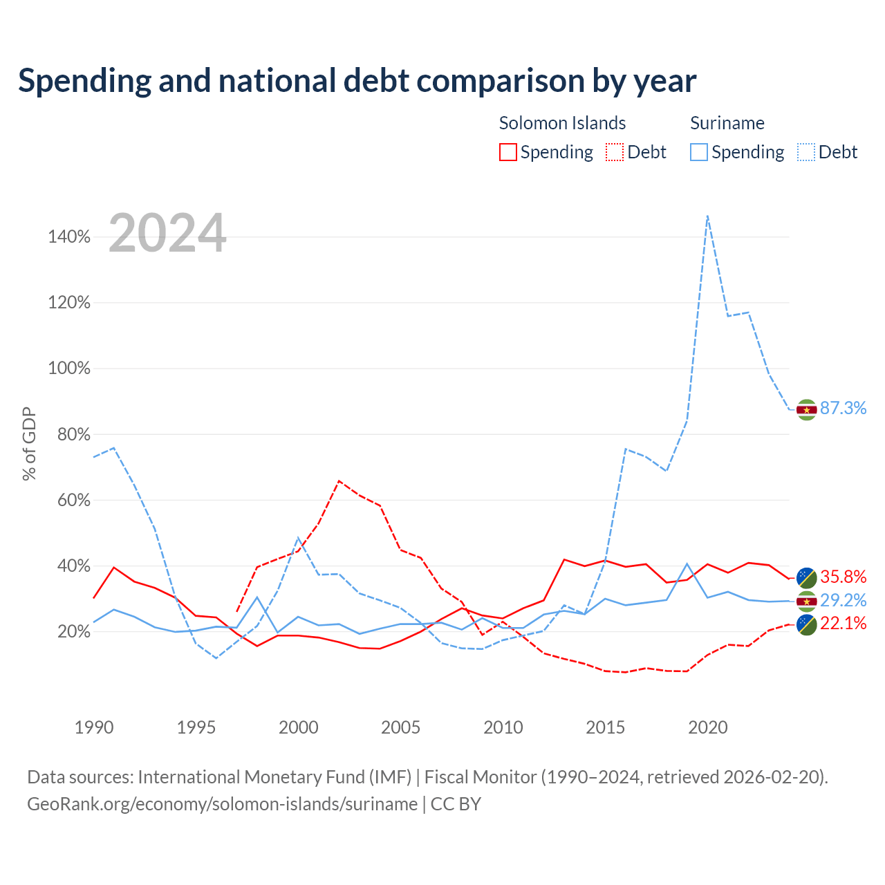 The Solomon Islands has $350M in government debt (22.1% of GDP), compared to $3.86B (87.3% of GDP) in Suriname.