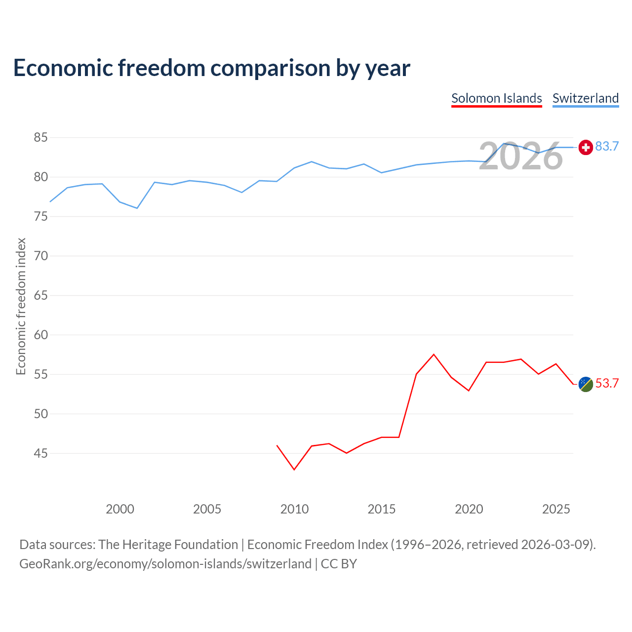 The Economic Freedom Index for the Solomon Islands is 53.7, ranking 137/197, compared to 83.7 for Switzerland, ranking 2/197. The chart above displays a comparison of annual changes in economic freedom indexes.