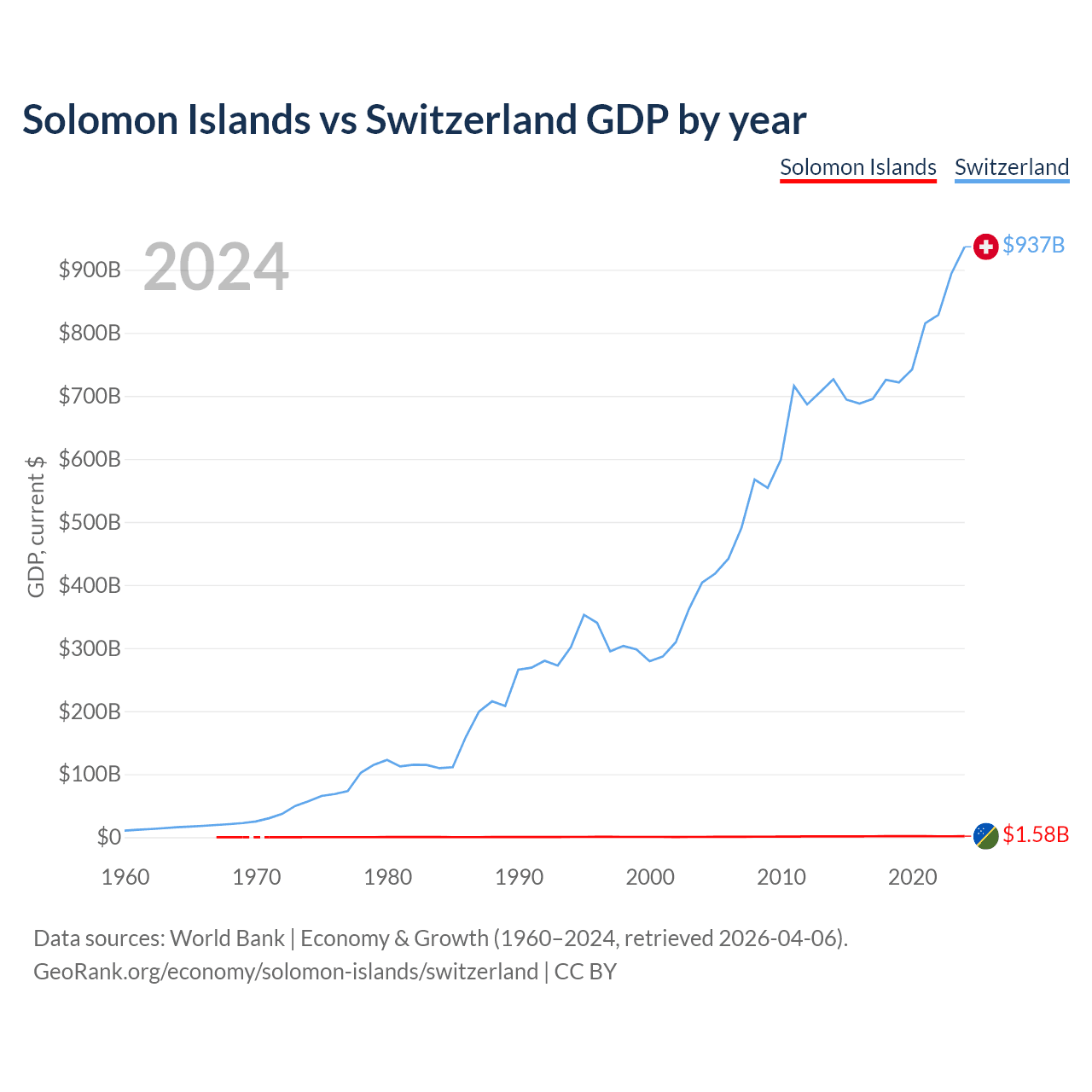 The Solomon Islands has a GDP of $1.58B compared to $937B for Switzerland, ranking 182/197 and 20/197 by economy size, respectively.