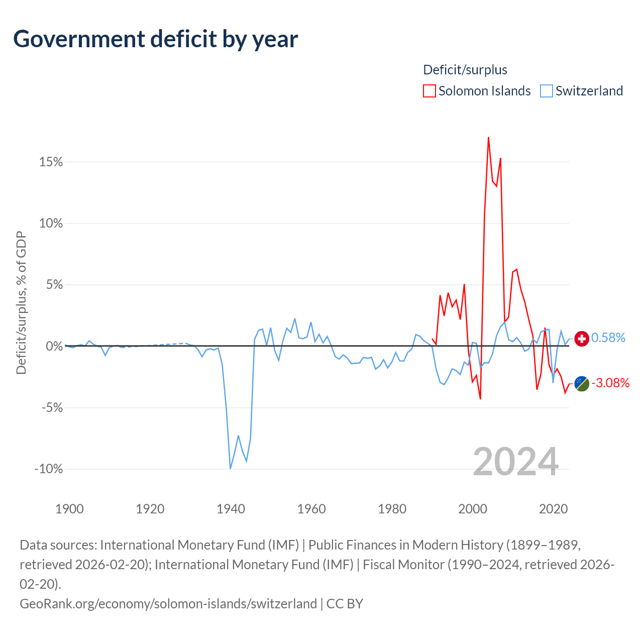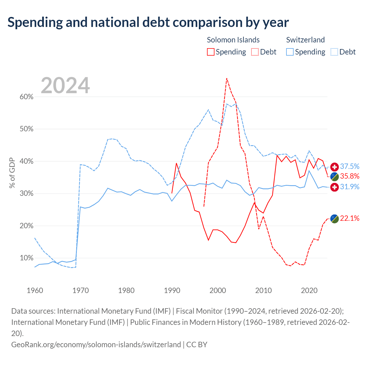 The Solomon Islands has $350M in government debt (22.1% of GDP), compared to $351B (37.5% of GDP) in Switzerland.