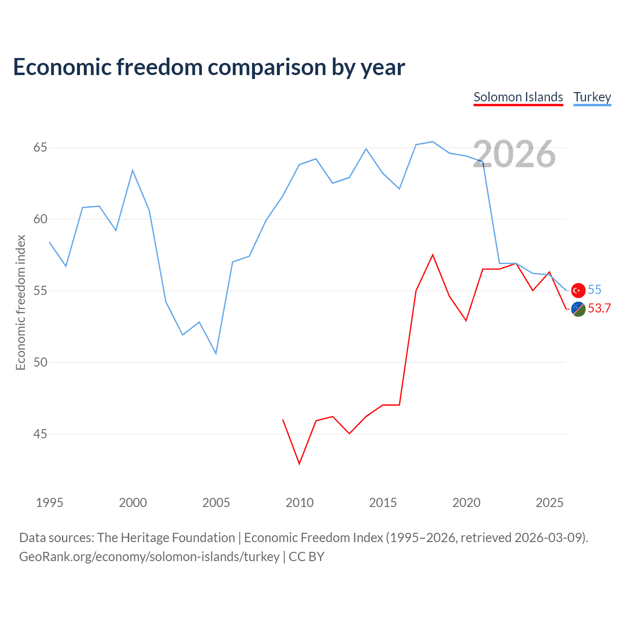 The Economic Freedom Index for the Solomon Islands is 53.7, ranking 137/197, compared to 55 for Turkey, ranking 129/197. The chart above displays a comparison of annual changes in economic freedom indexes.