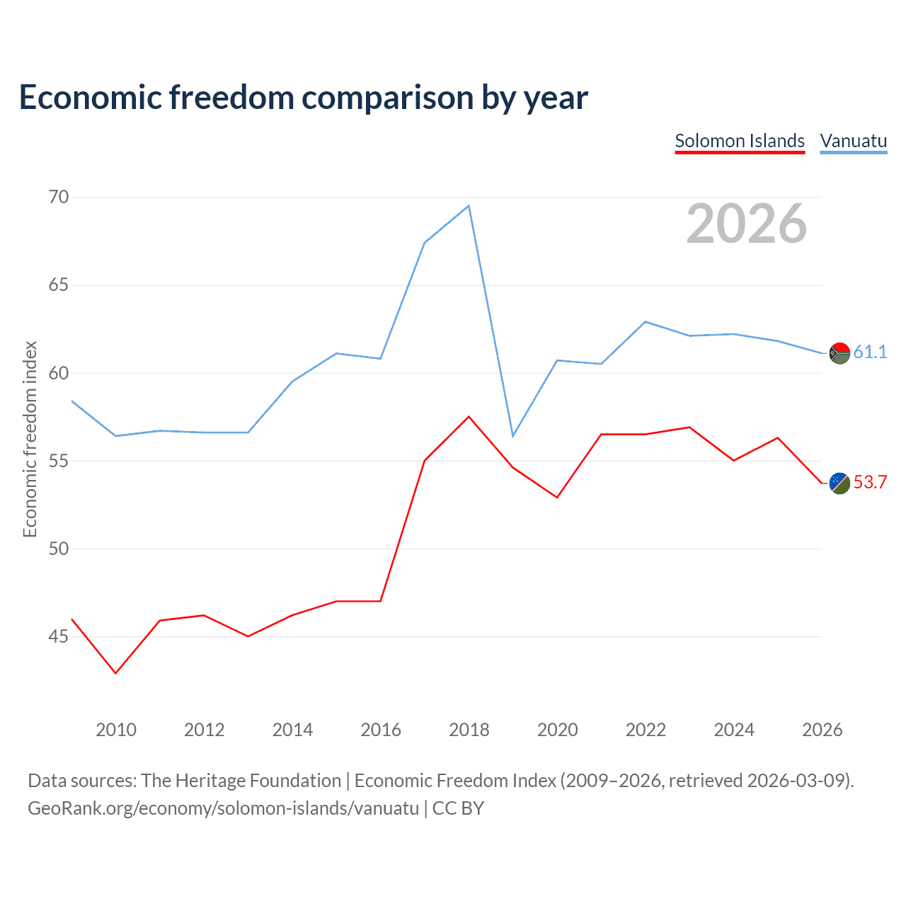 The Economic Freedom Index for the Solomon Islands is 53.7, ranking 137/197, compared to 61.1 for Vanuatu, ranking 92/197. The chart above displays a comparison of annual changes in economic freedom indexes.