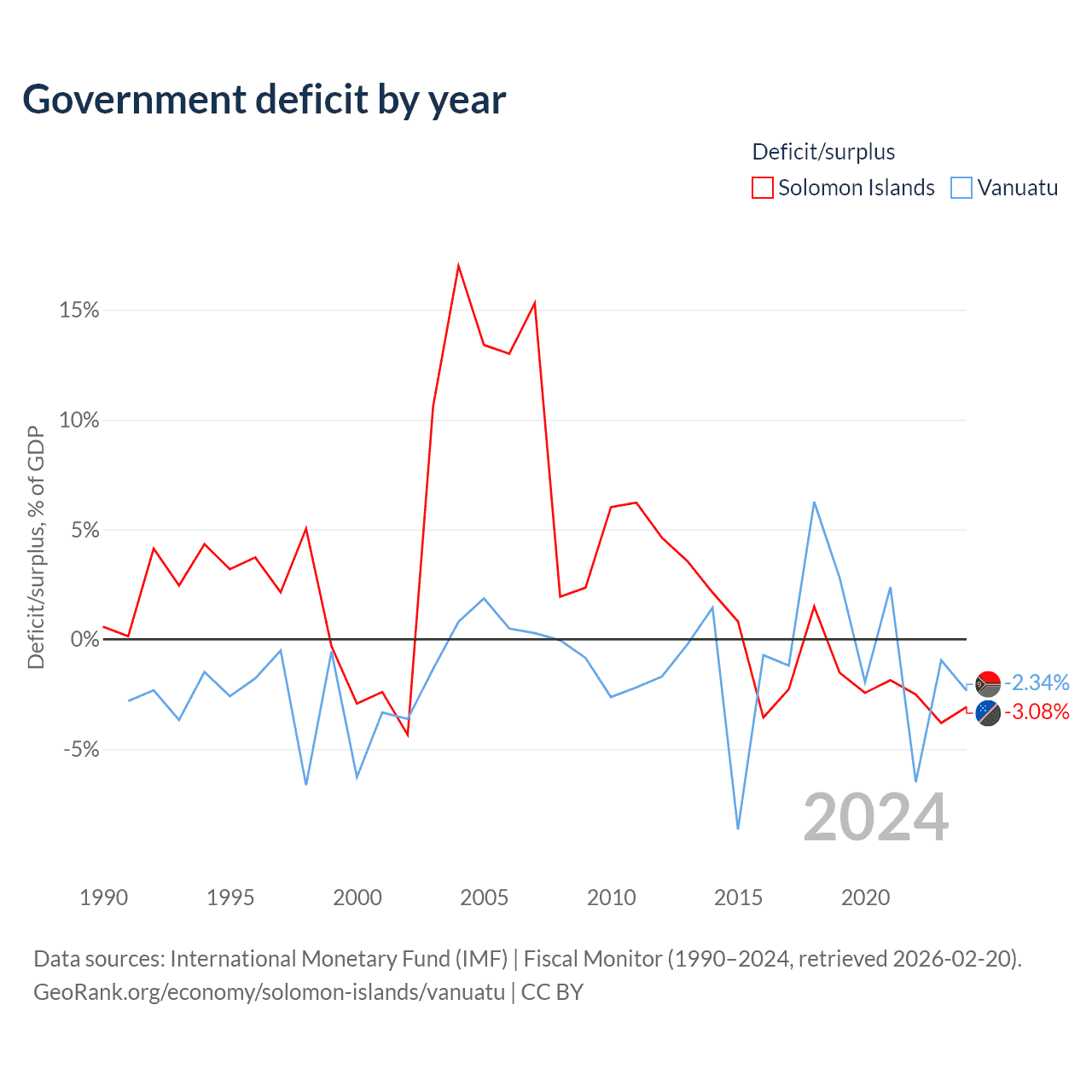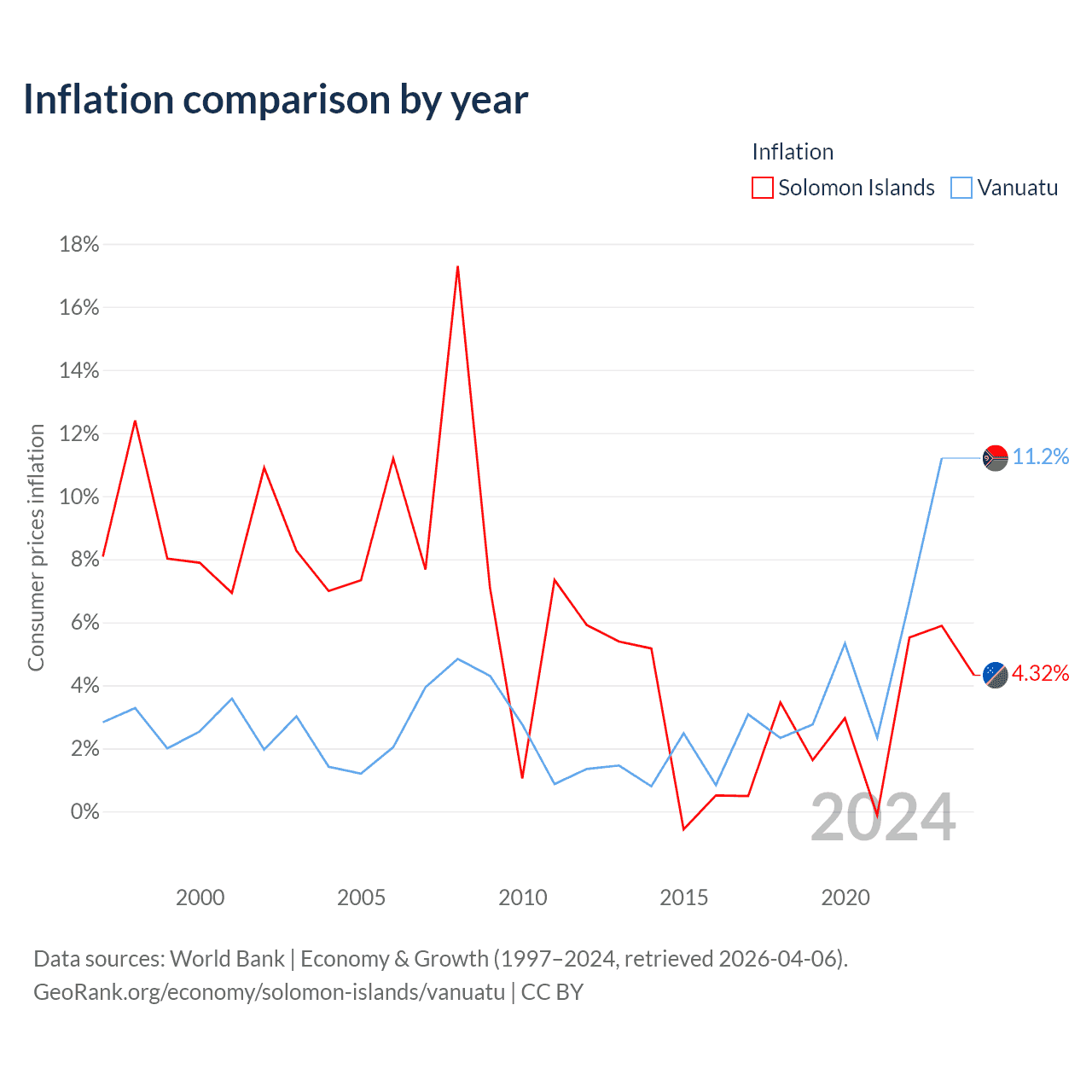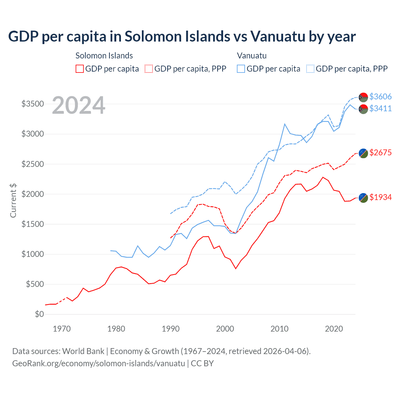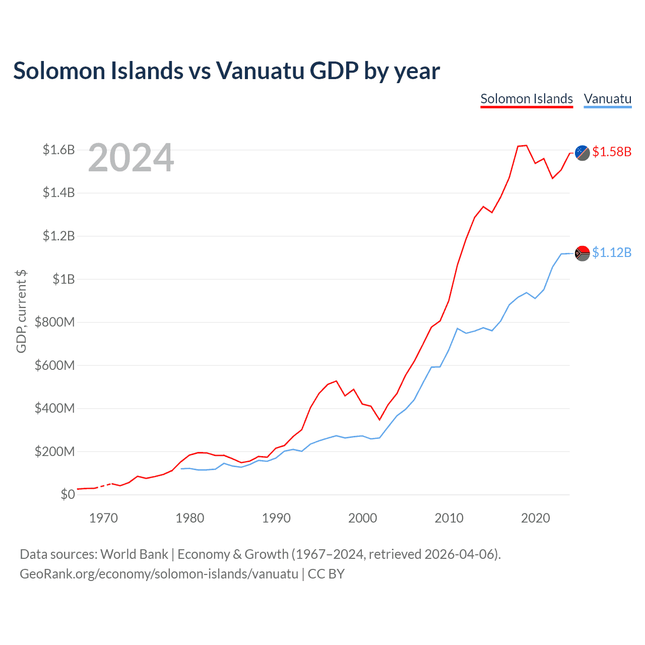 The Solomon Islands has a GDP of $1.58B compared to $1.12B for Vanuatu, ranking 182/197 and 188/197 by economy size, respectively.