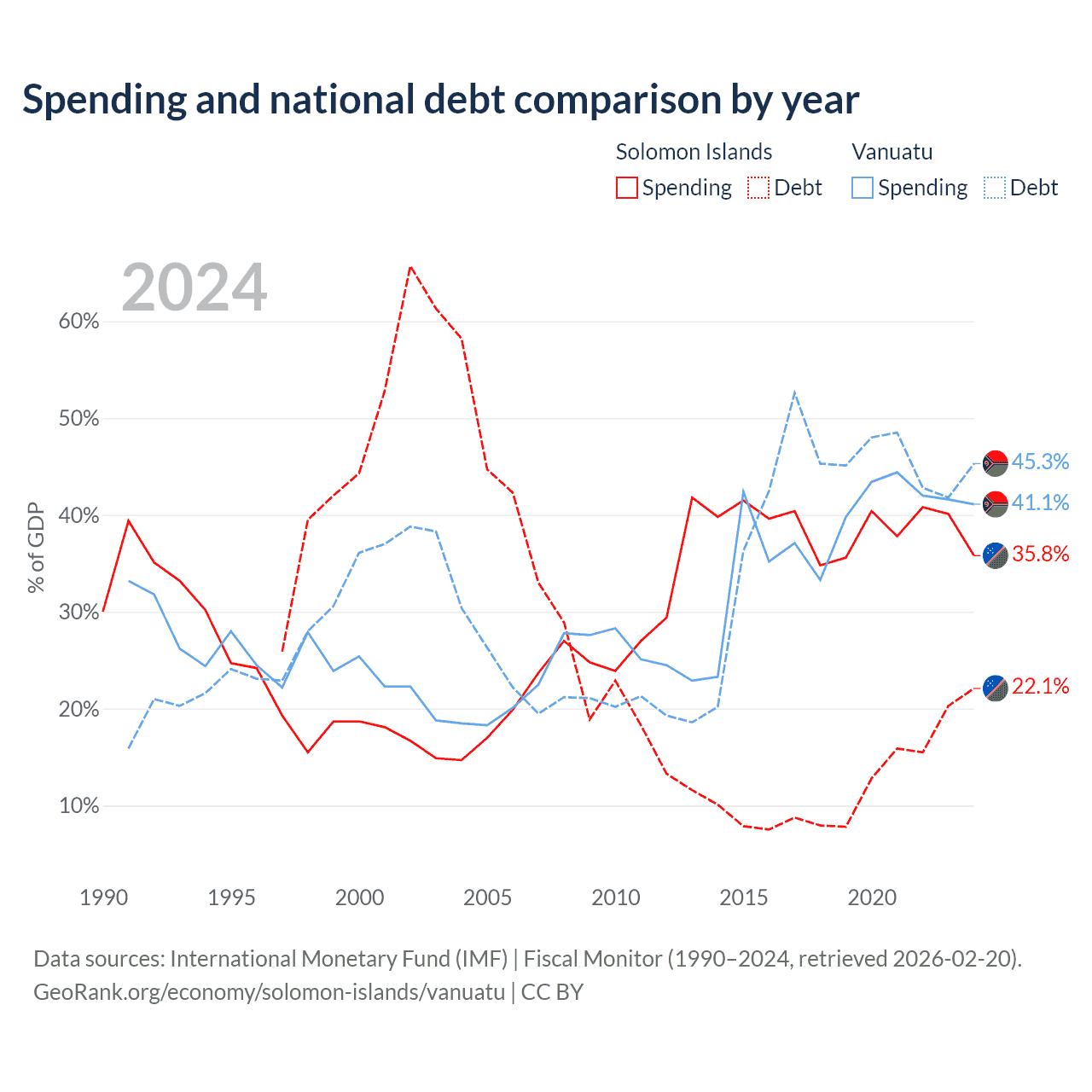 The Solomon Islands has $350M in government debt (22.1% of GDP), compared to $507M (45.3% of GDP) in Vanuatu.