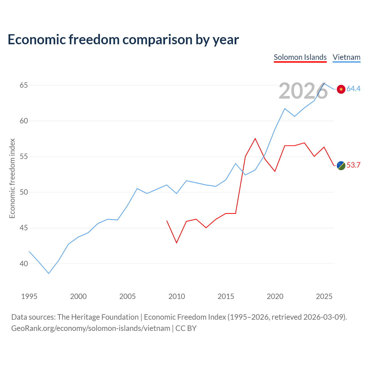 The Economic Freedom Index for the Solomon Islands is 53.7, ranking 137/197, compared to 64.4 for Vietnam, ranking 73/197. The chart above displays a comparison of annual changes in economic freedom indexes.