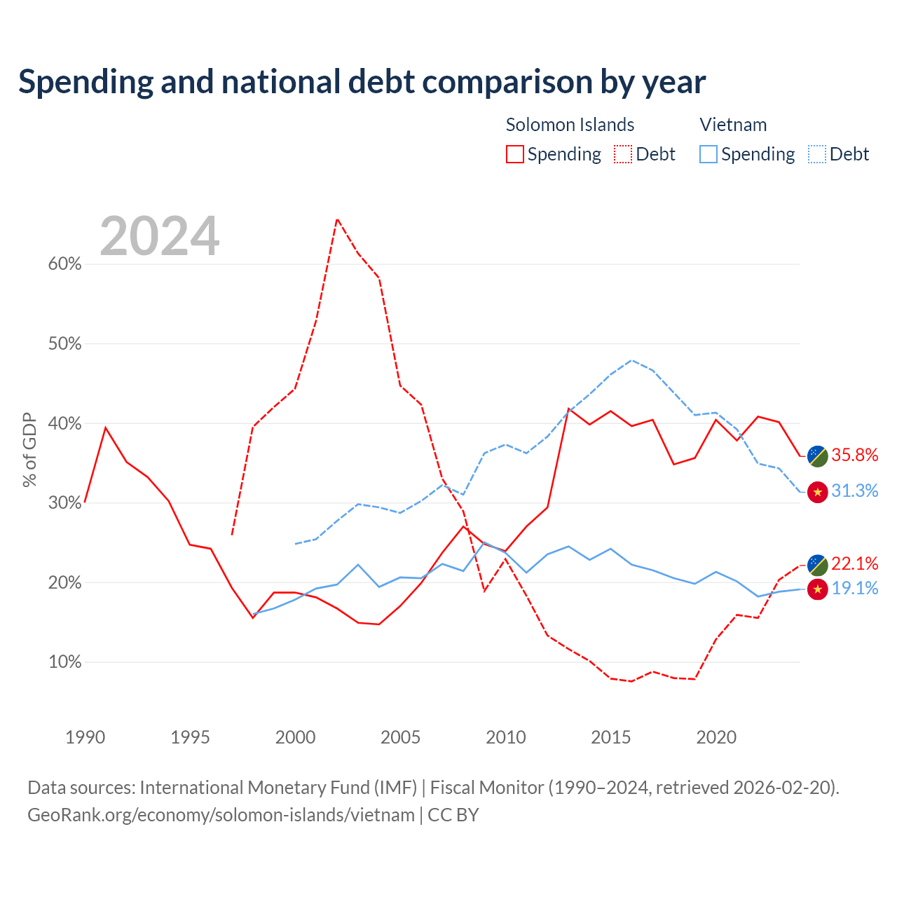 The Solomon Islands has $350M in government debt (22.1% of GDP), compared to $149B (31.3% of GDP) in Vietnam.