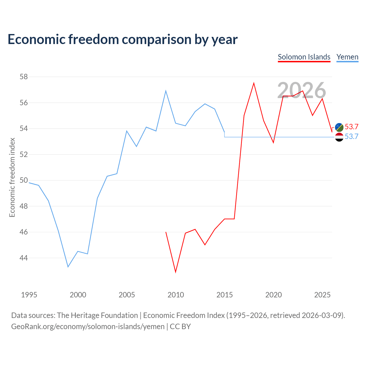 The Economic Freedom Index for the Solomon Islands is 53.7, ranking 137/197, compared to 53.7 for Yemen, ranking 138/197. The chart above displays a comparison of annual changes in economic freedom indexes.