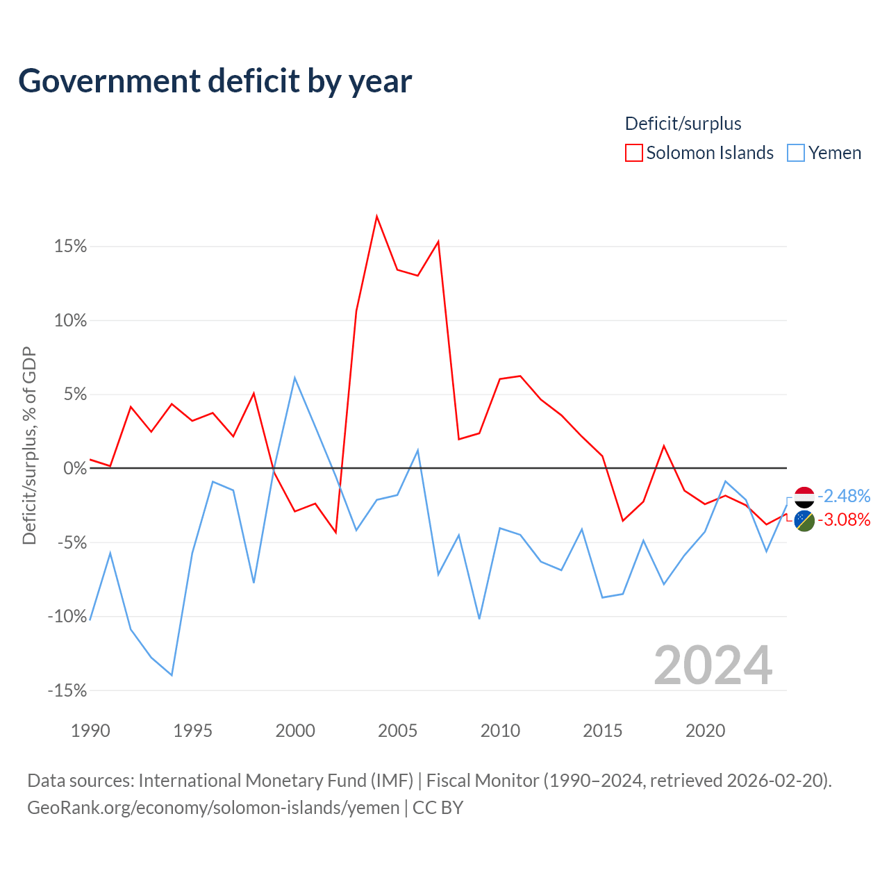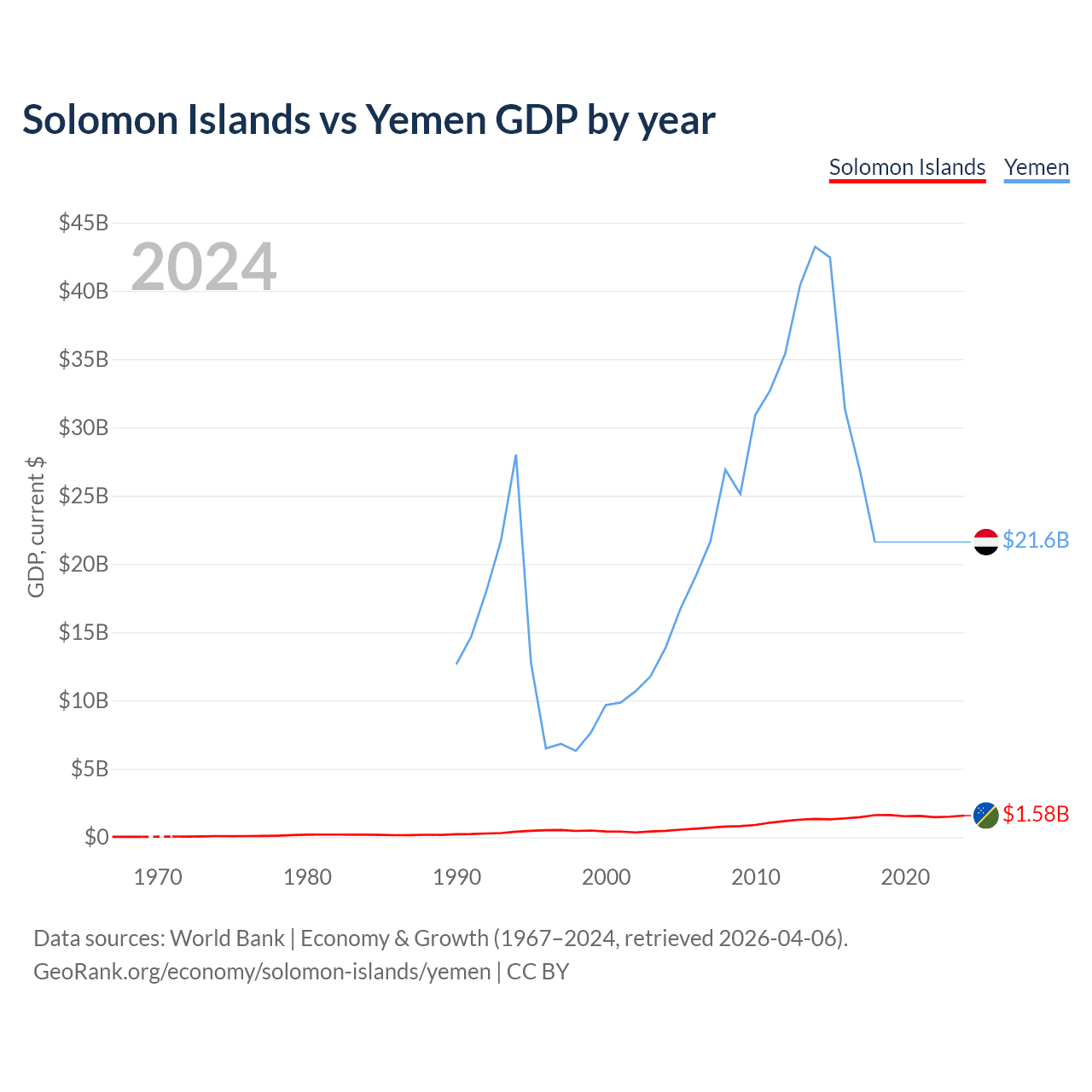 The Solomon Islands has a GDP of $1.58B compared to $21.6B for Yemen, ranking 182/197 and 125/197 by economy size, respectively.