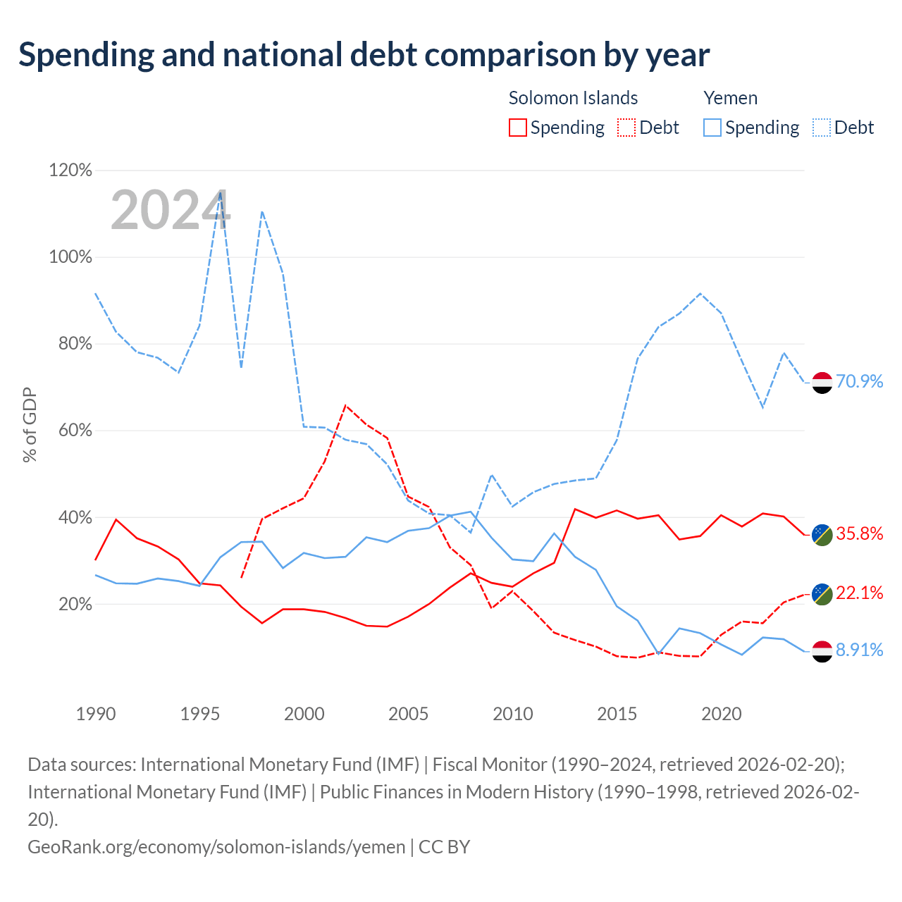 The Solomon Islands has $350M in government debt (22.1% of GDP), compared to $18.8B (70.9% of GDP) in Yemen.