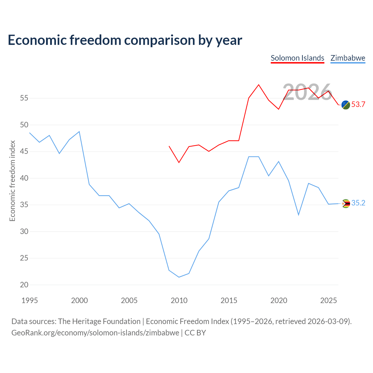 The Economic Freedom Index for the Solomon Islands is 53.7, ranking 137/197, compared to 35.2 for Zimbabwe, ranking 190/197. The chart above displays a comparison of annual changes in economic freedom indexes.