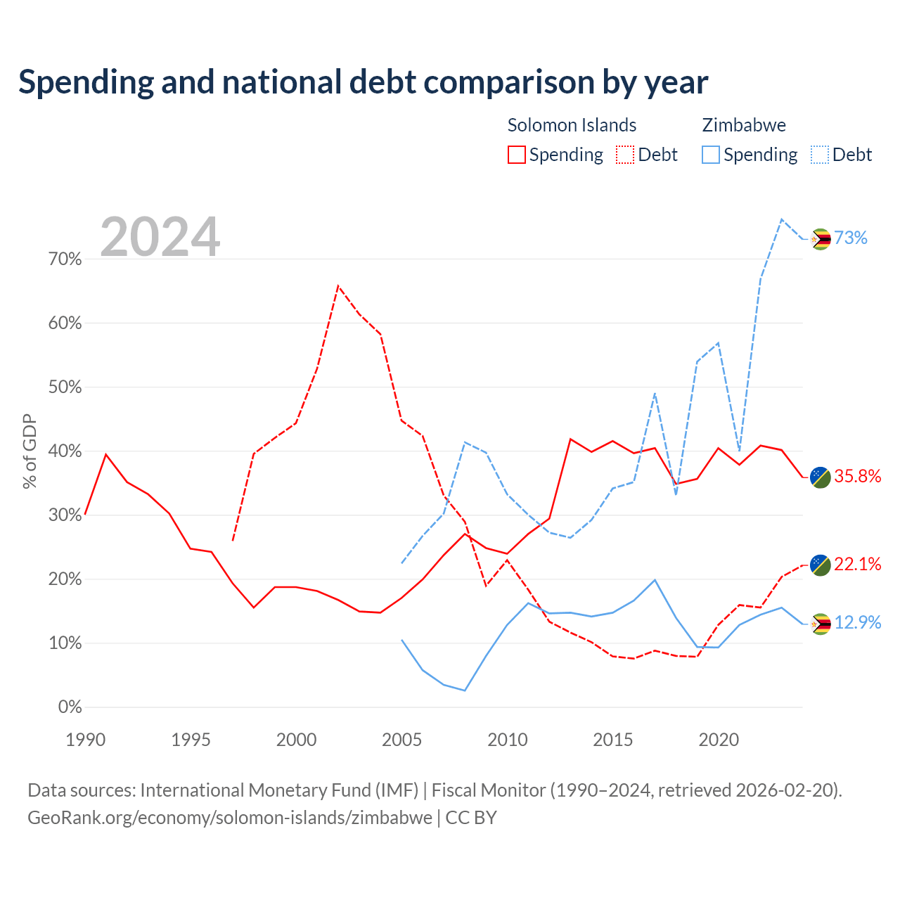 The Solomon Islands has $350M in government debt (22.1% of GDP), compared to $30.3B (73% of GDP) in Zimbabwe.