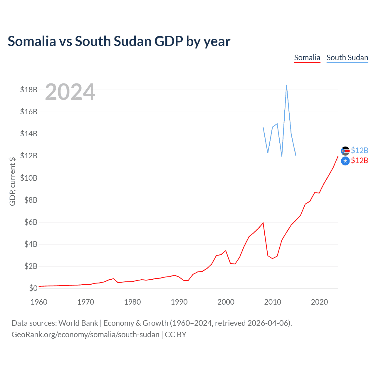 Somalia has a GDP of $12B compared to $12B for South Sudan, ranking 150/197 and 149/197 by economy size, respectively.