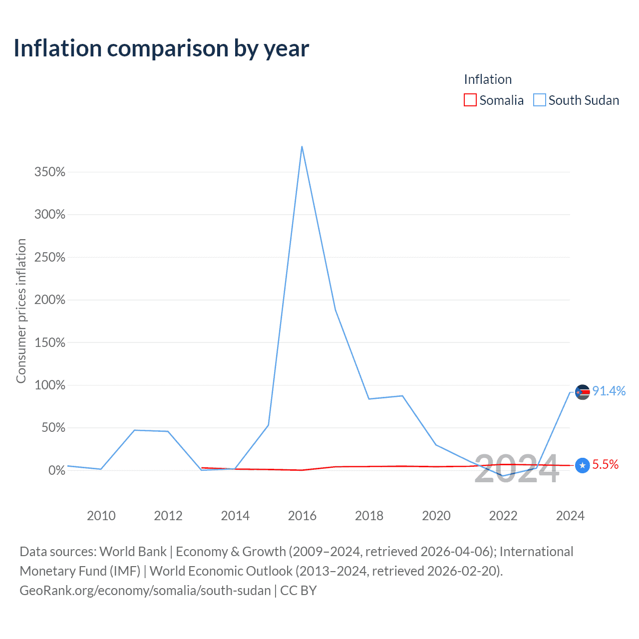 Over the past 12 years, Somalia has recorded an average annual inflation rate of 3.77%, compared with 76.7% in South Sudan. In 2024, inflation was 5.5% in Somalia and 91.4% in South Sudan.
