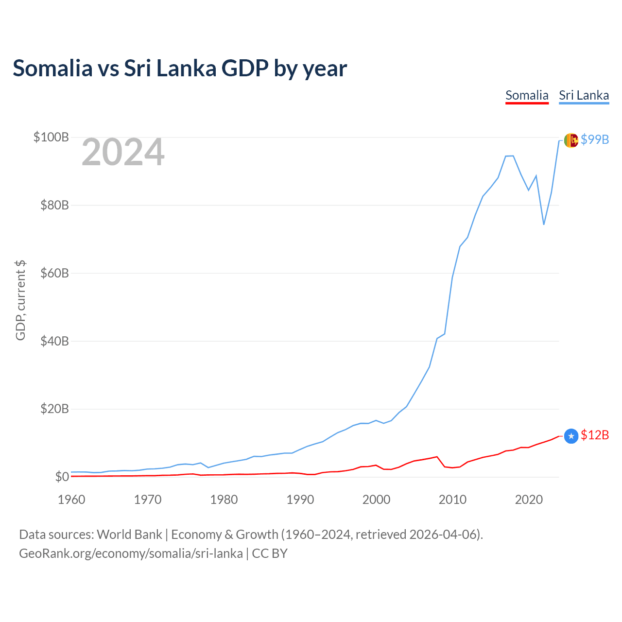 Somalia has a GDP of $12B compared to $99B for Sri Lanka, ranking 150/197 and 72/197 by economy size, respectively.