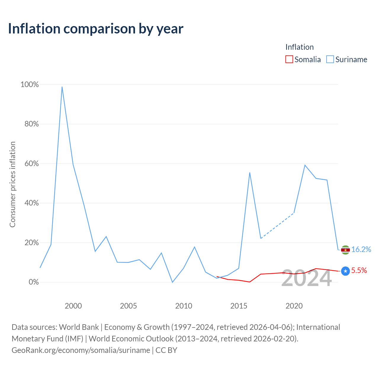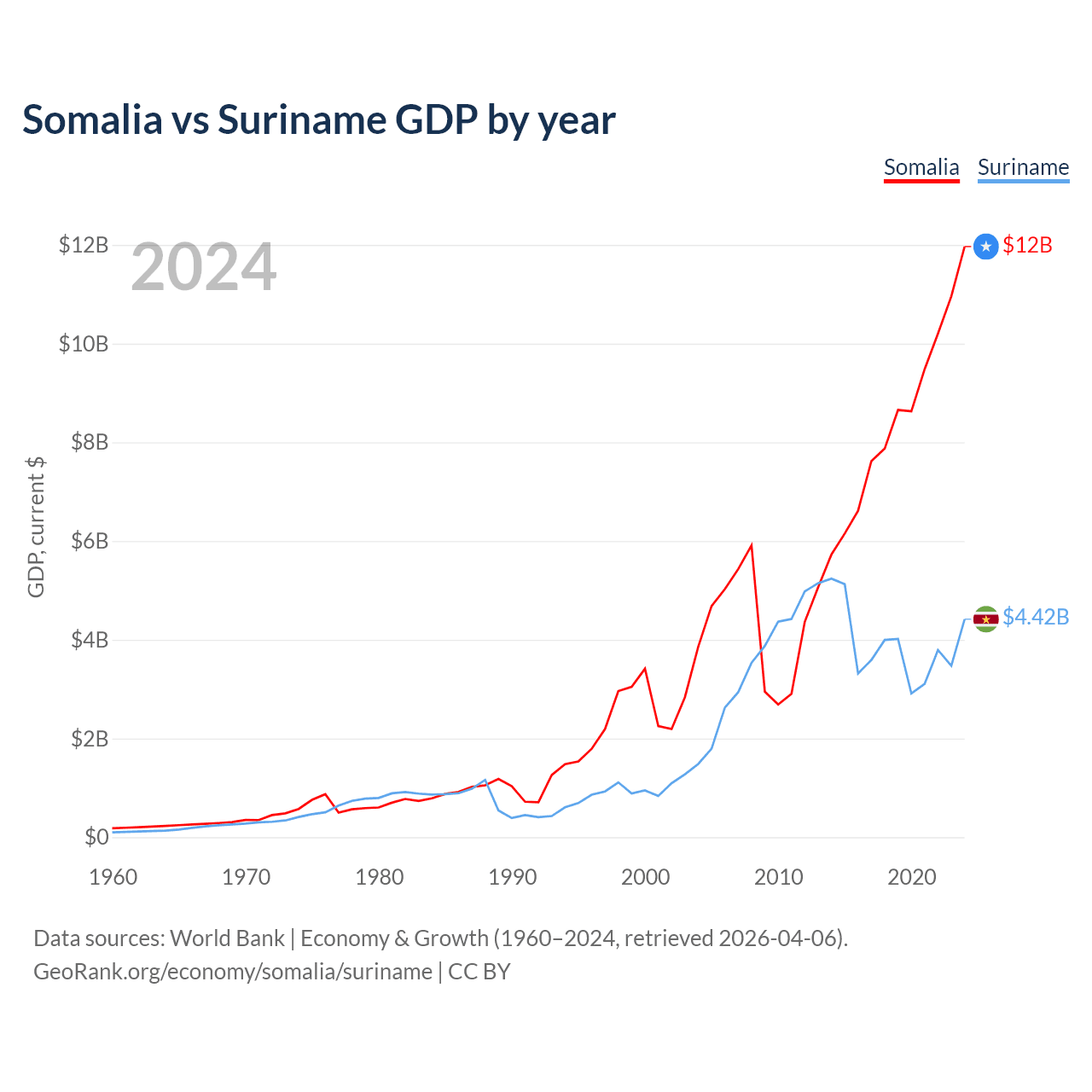 Somalia has a GDP of $12B compared to $4.42B for Suriname, ranking 150/197 and 164/197 by economy size, respectively.