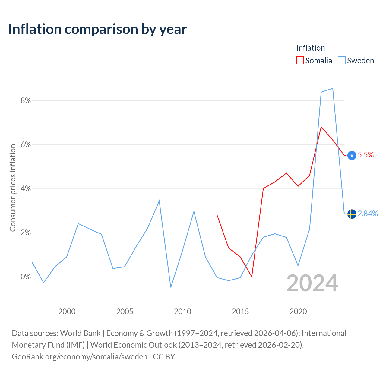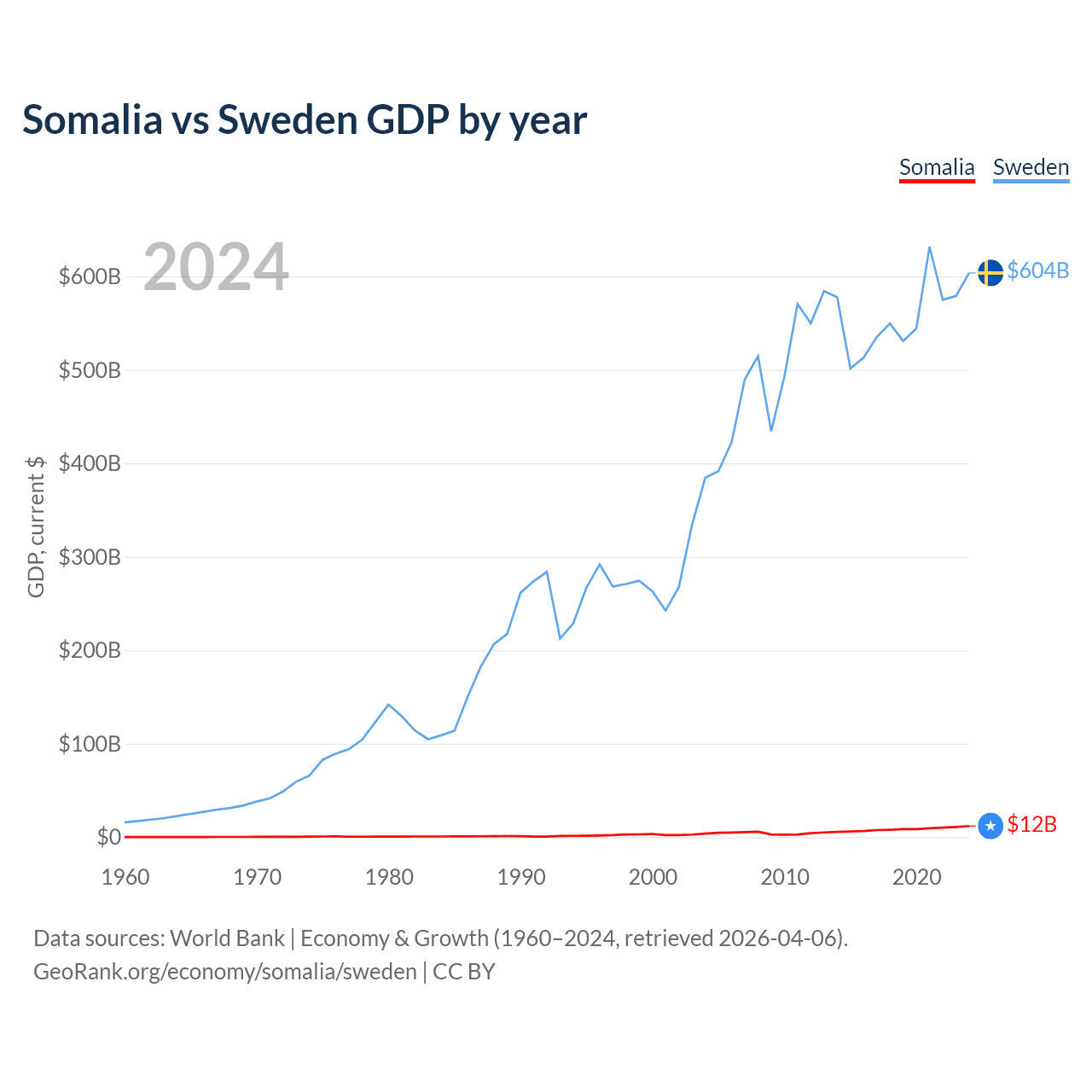 Somalia has a GDP of $12B compared to $604B for Sweden, ranking 150/197 and 26/197 by economy size, respectively.