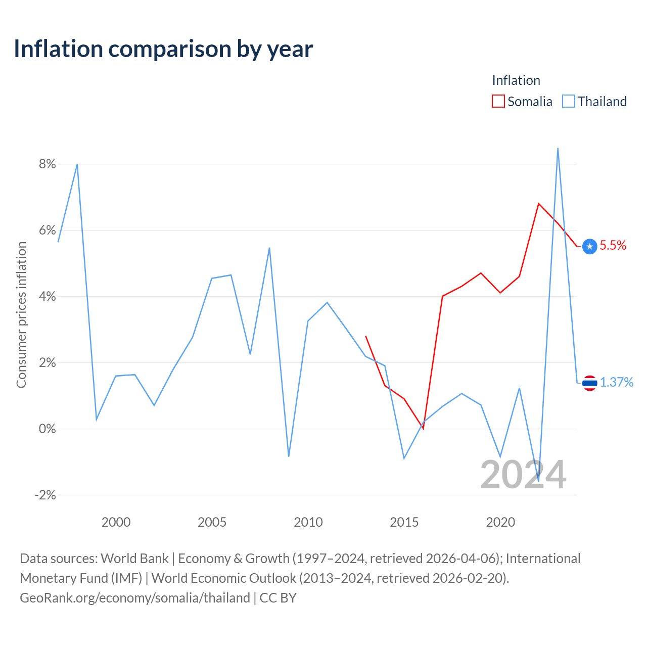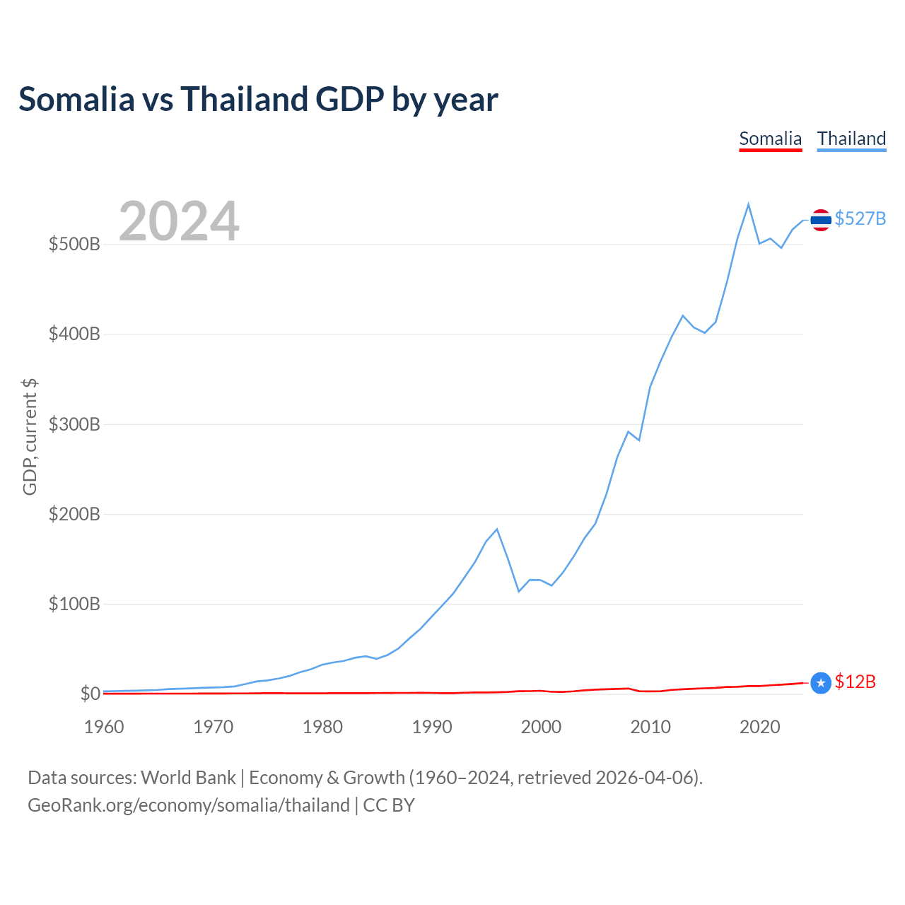 Somalia has a GDP of $12B compared to $527B for Thailand, ranking 150/197 and 31/197 by economy size, respectively.
