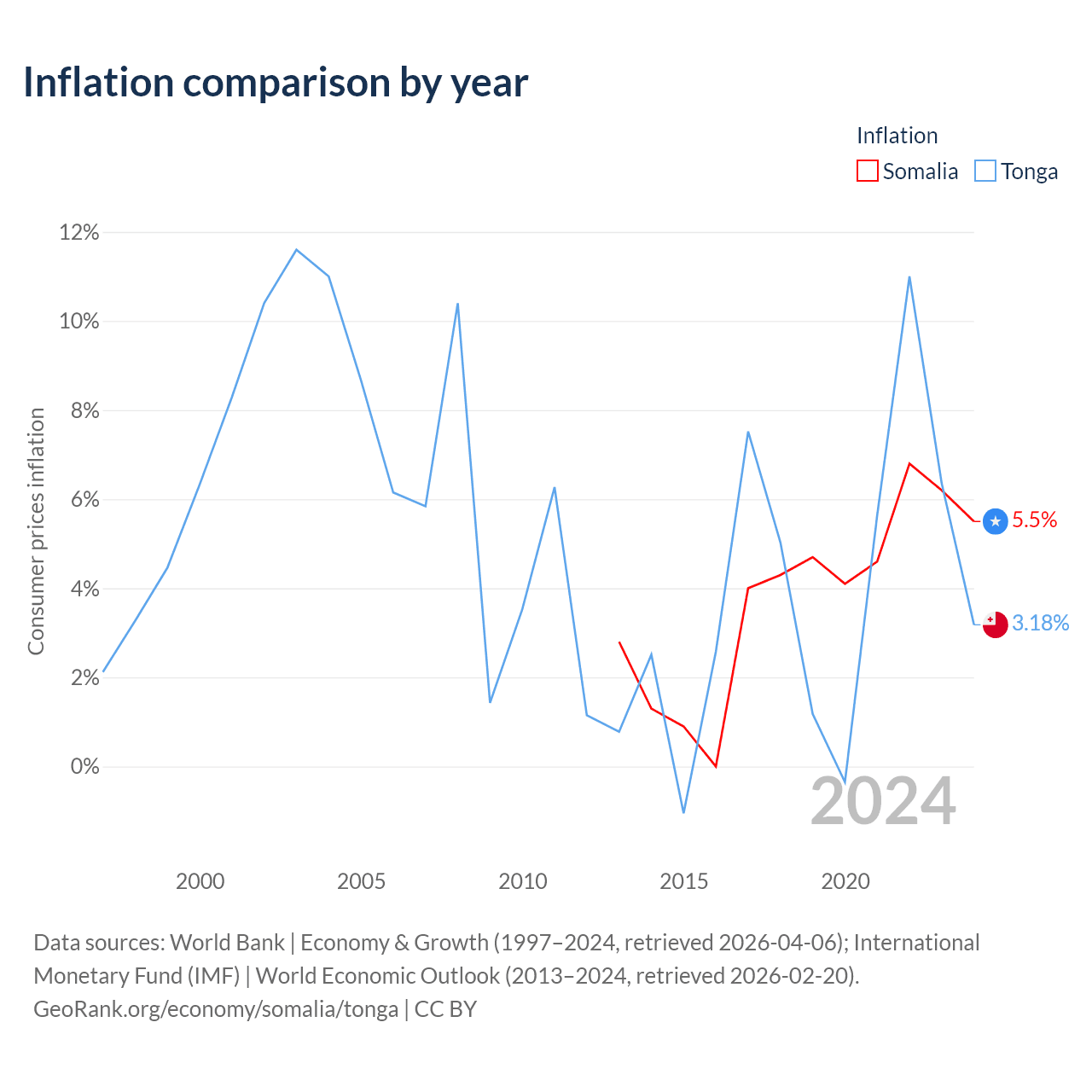 Over the past 12 years, Somalia has recorded an average annual inflation rate of 3.77%, compared with 3.69% in Tonga. In 2024, inflation was 5.5% in Somalia and 3.18% in Tonga.