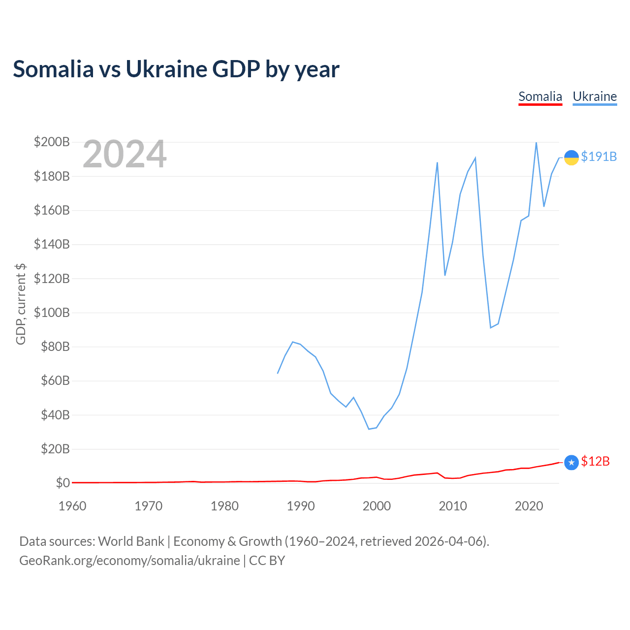 Somalia has a GDP of $12B compared to $191B for Ukraine, ranking 150/197 and 57/197 by economy size, respectively.