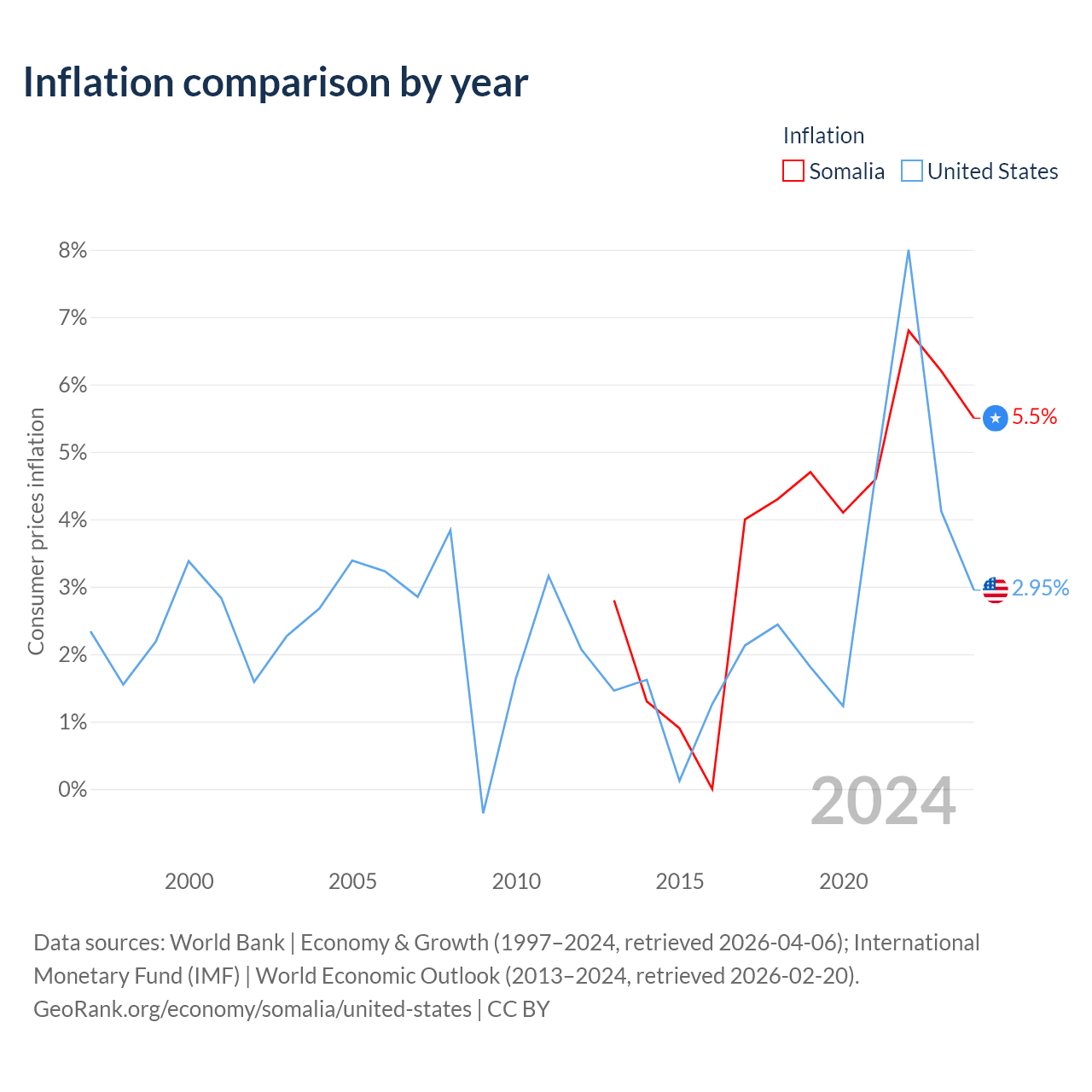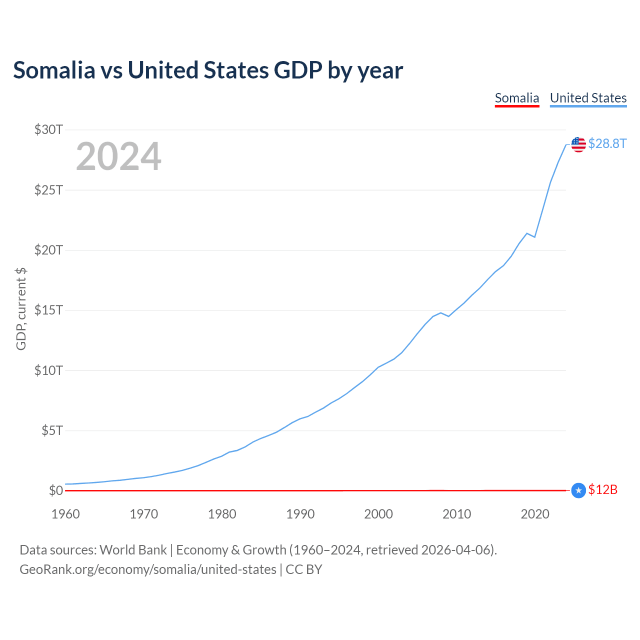 Somalia has a GDP of $12B compared to $28.8T for the United States, ranking 150/197 and 1/197 by economy size, respectively.