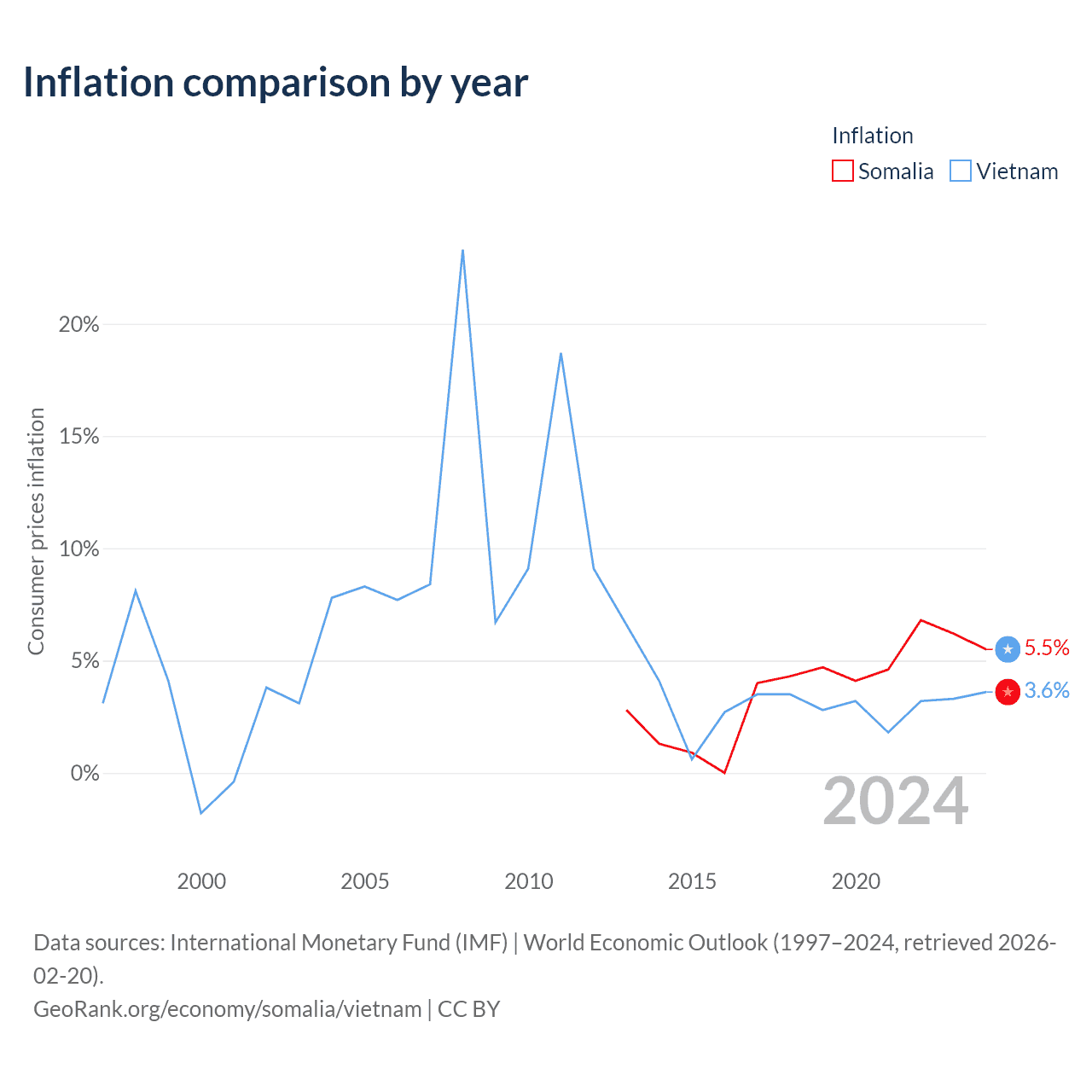 Over the past 12 years, Somalia has recorded an average annual inflation rate of 3.77%, compared with 3.24% in Vietnam. In 2024, inflation was 5.5% in Somalia and 3.6% in Vietnam.