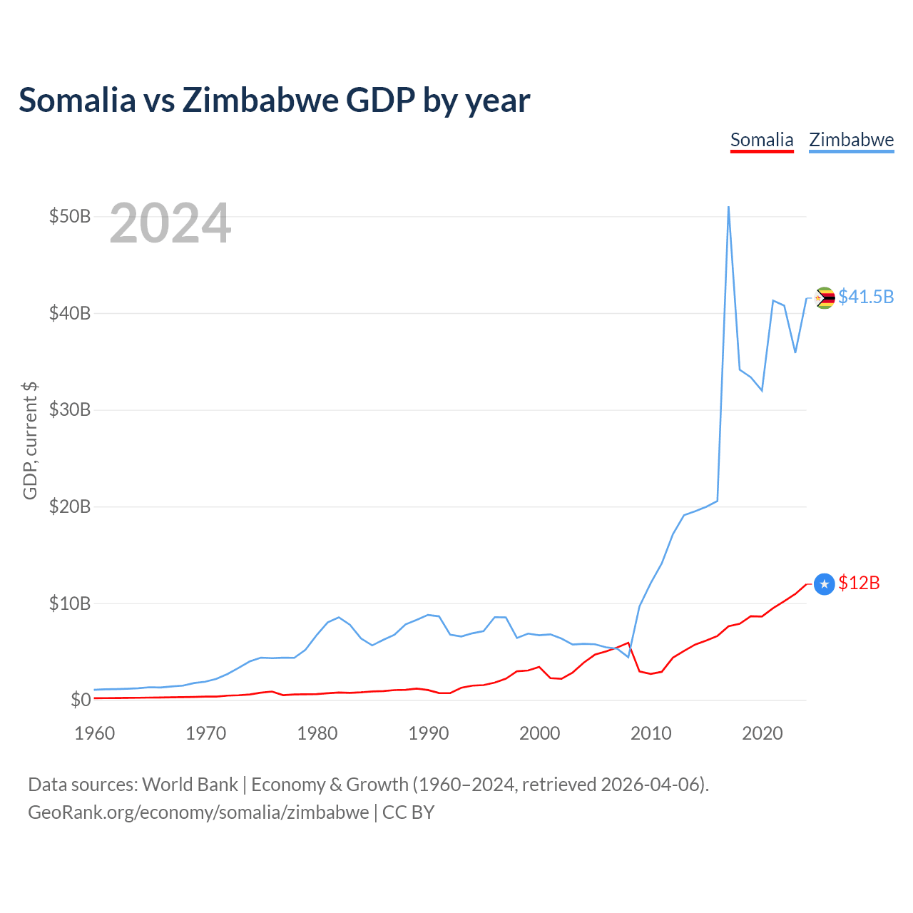Somalia has a GDP of $12B compared to $41.5B for Zimbabwe, ranking 150/197 and 102/197 by economy size, respectively.