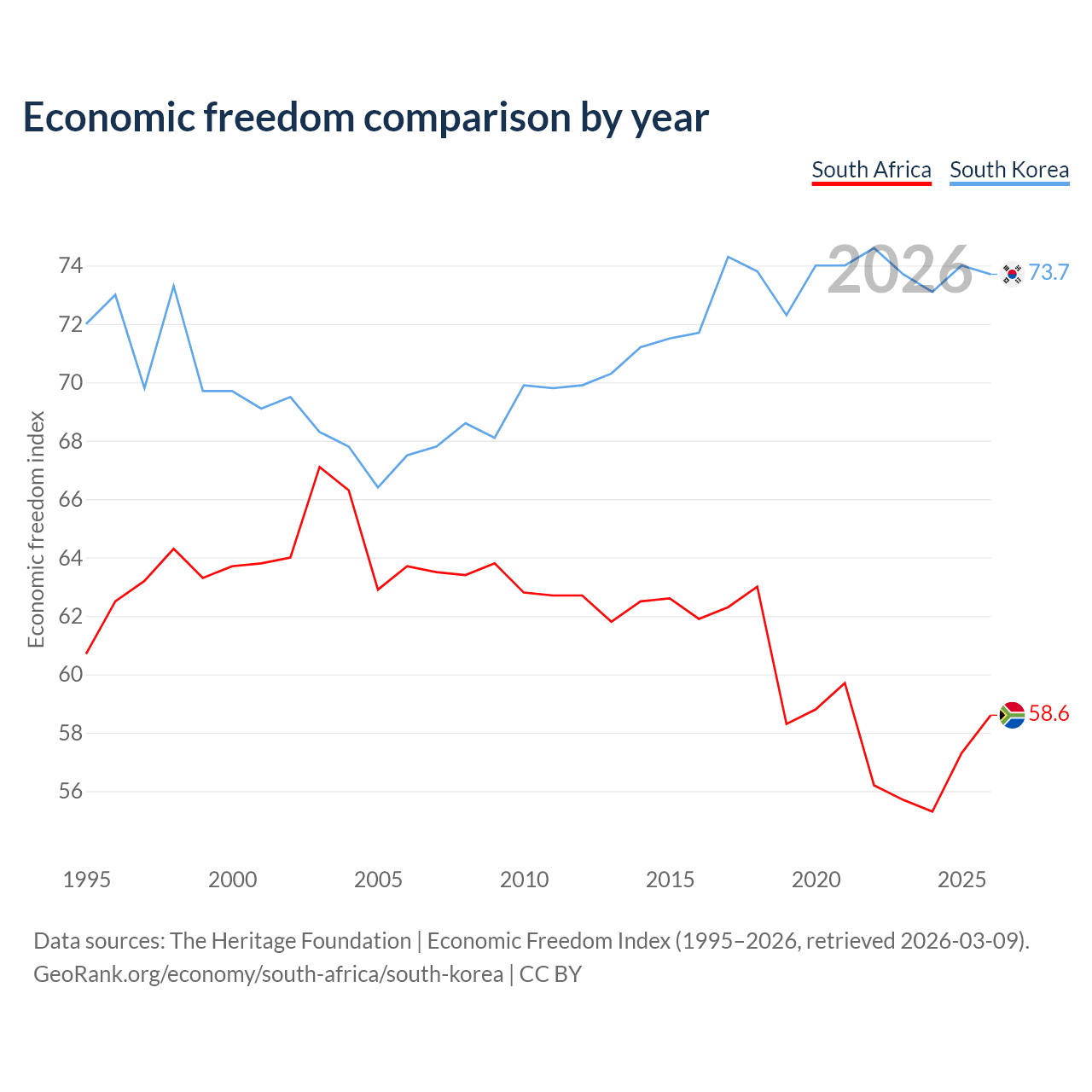 The Economic Freedom Index for South Africa is 58.6, ranking 110/197, compared to 73.7 for South Korea, ranking 24/197. The chart above displays a comparison of annual changes in economic freedom indexes.