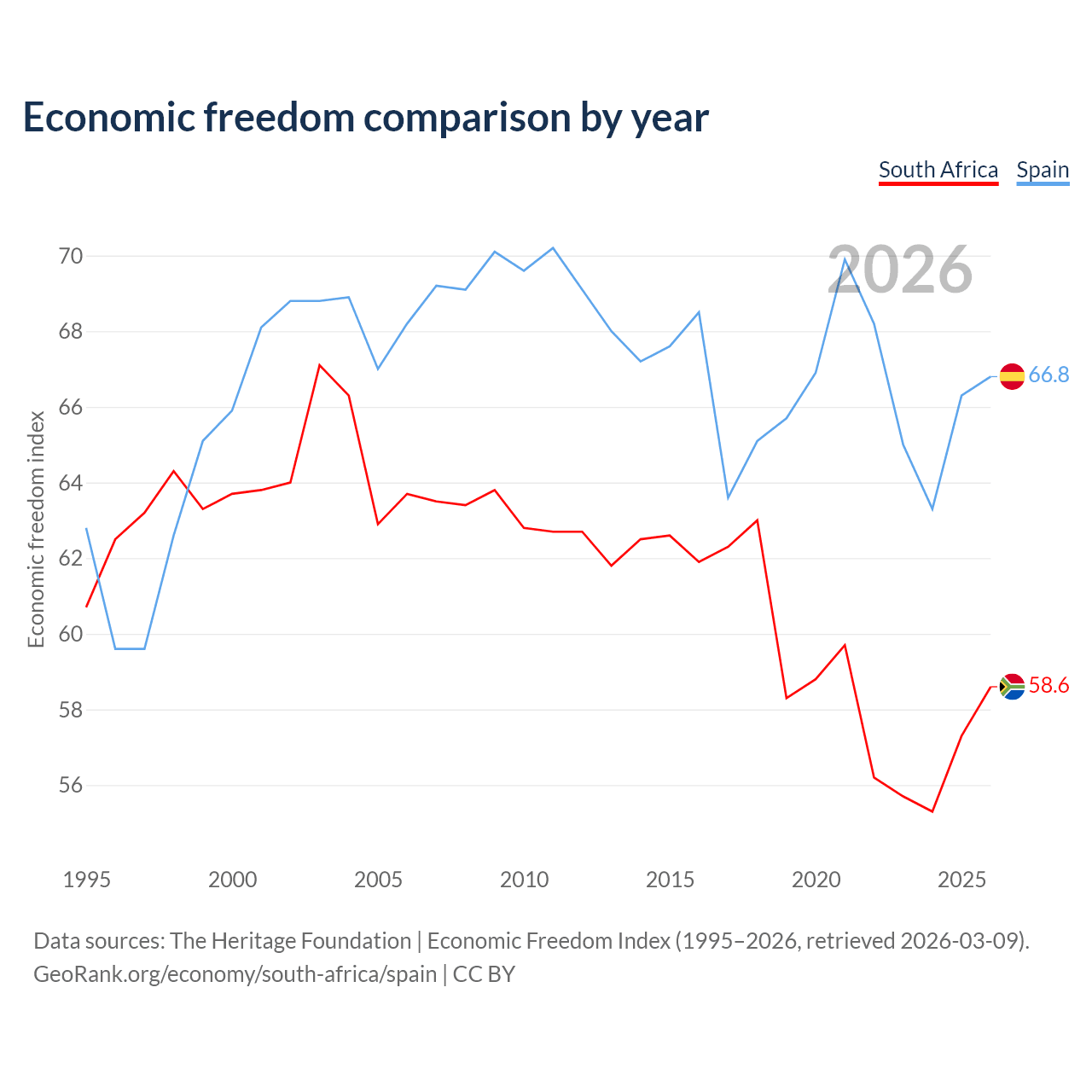 The Economic Freedom Index for South Africa is 58.6, ranking 110/197, compared to 66.8 for Spain, ranking 59/197. The chart above displays a comparison of annual changes in economic freedom indexes.