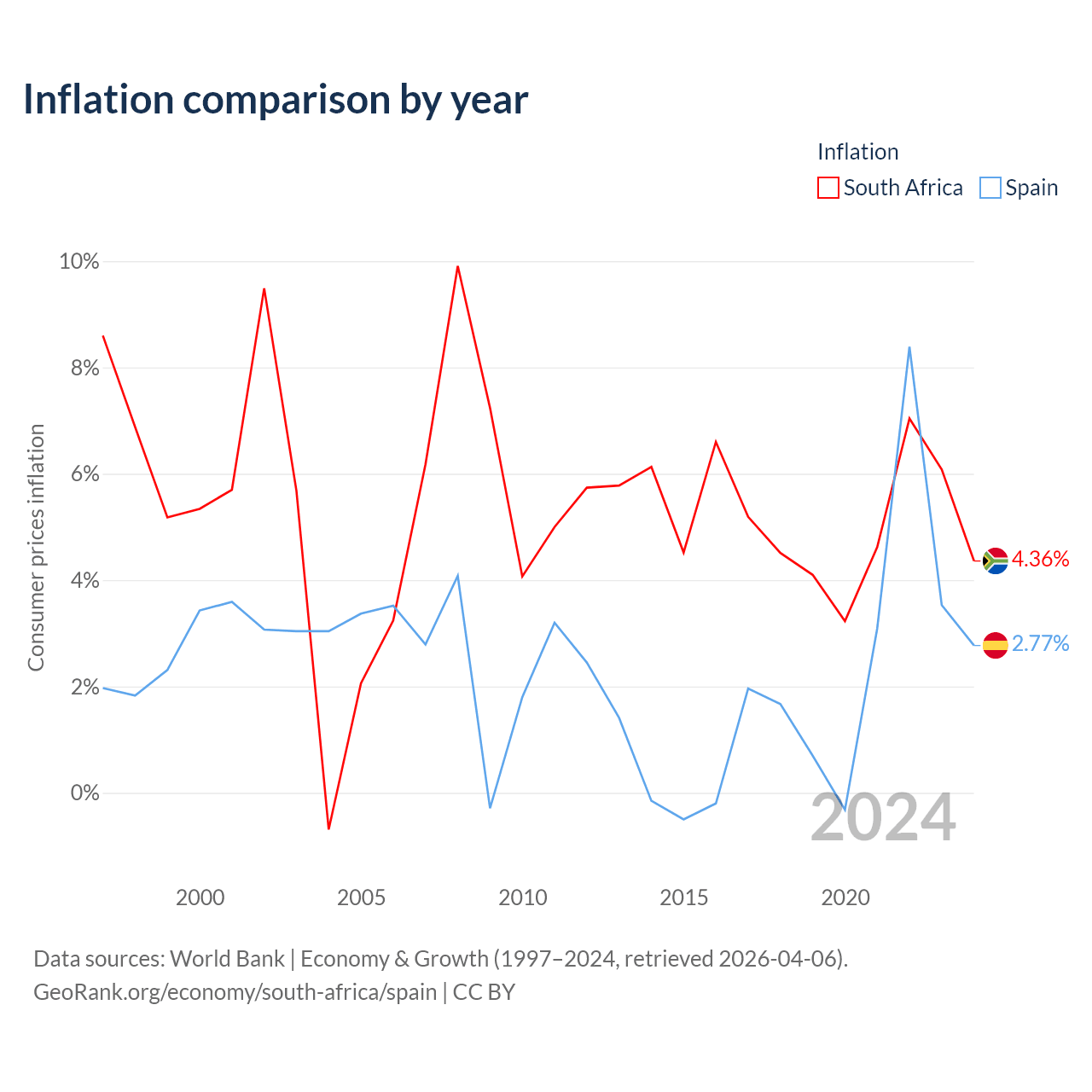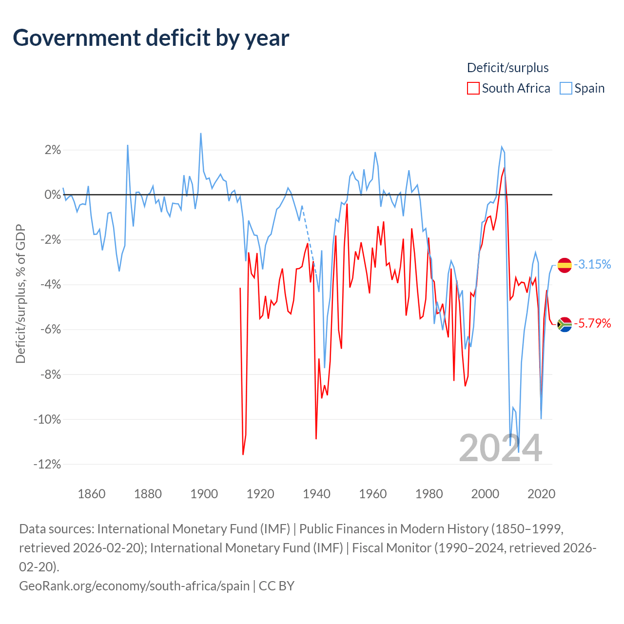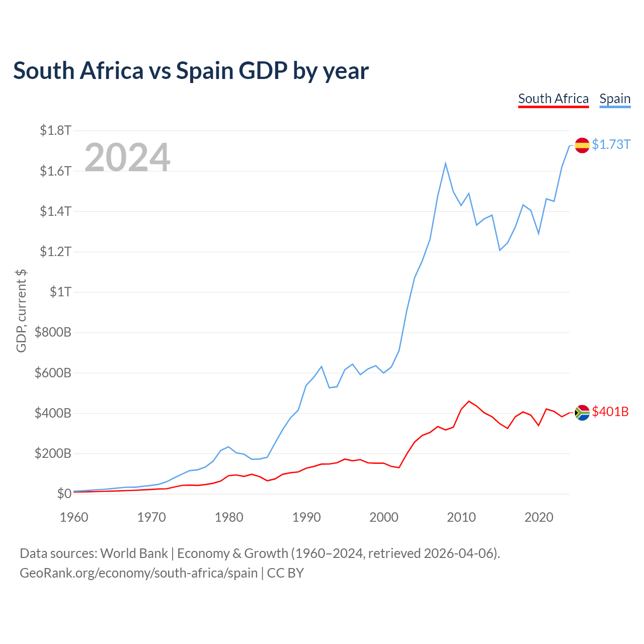South Africa has a GDP of $401B compared to $1.73T for Spain, ranking 40/197 and 15/197 by economy size, respectively.
