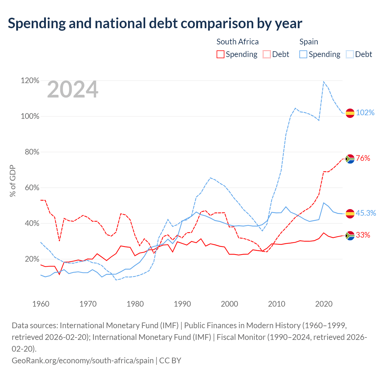 South Africa has $305B in government debt (76% of GDP), compared to $1.75T (101.6% of GDP) in Spain.