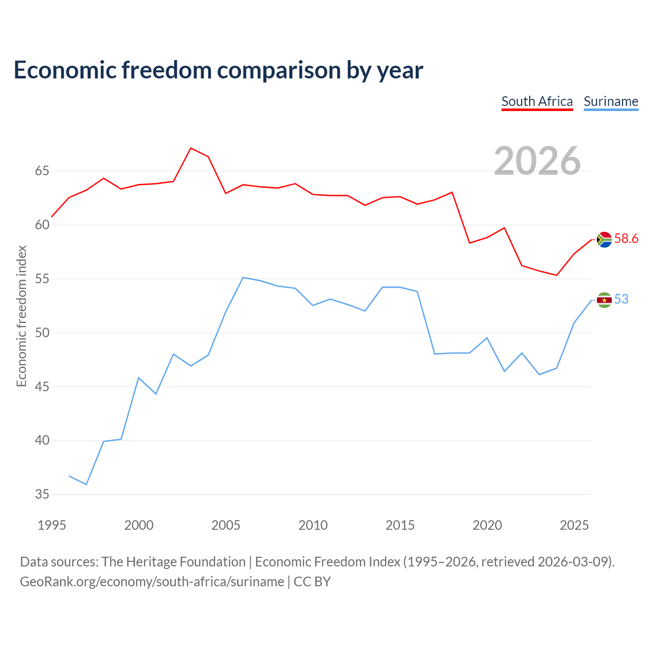 The Economic Freedom Index for South Africa is 58.6, ranking 110/197, compared to 53 for Suriname, ranking 143/197. The chart above displays a comparison of annual changes in economic freedom indexes.