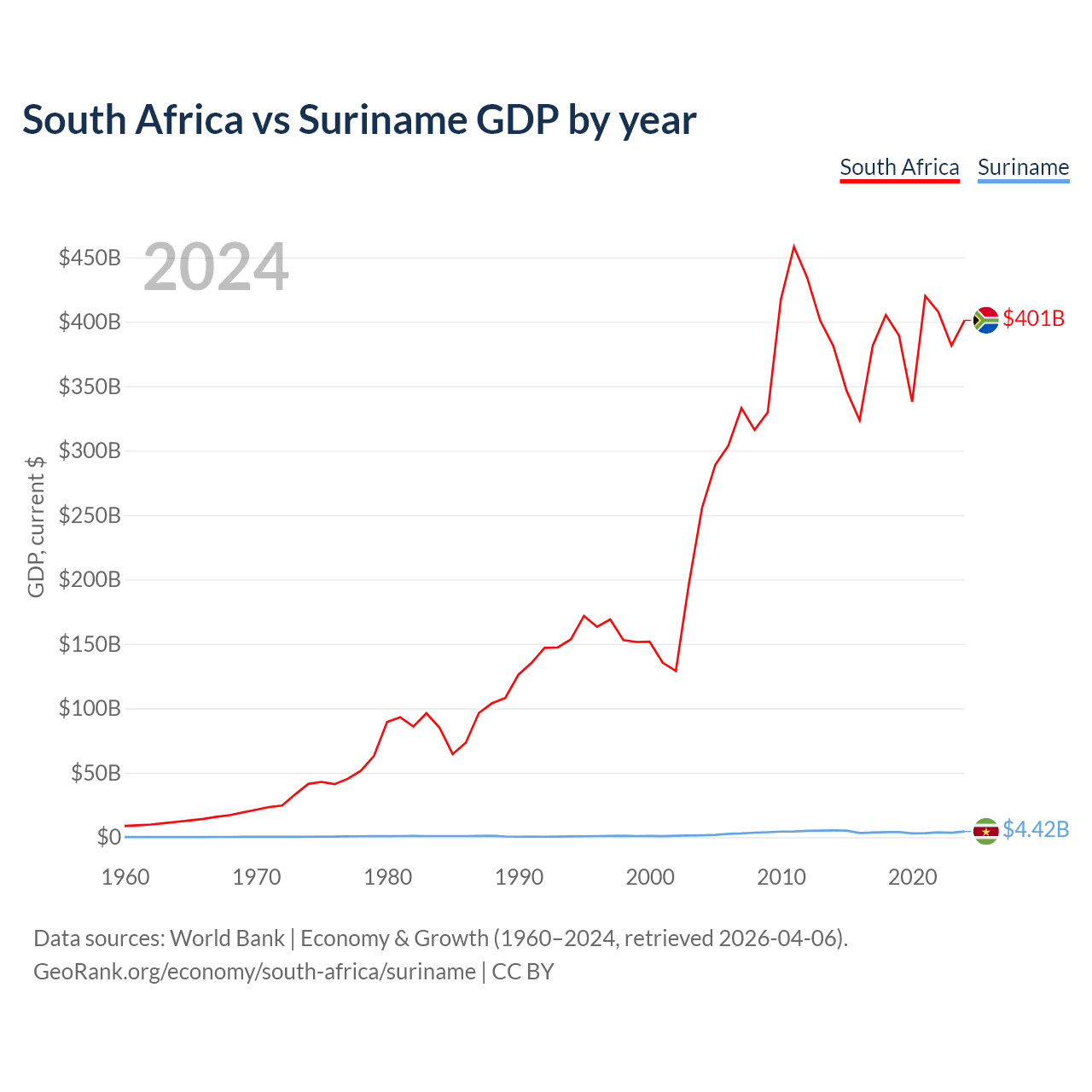 South Africa has a GDP of $401B compared to $4.42B for Suriname, ranking 40/197 and 164/197 by economy size, respectively.