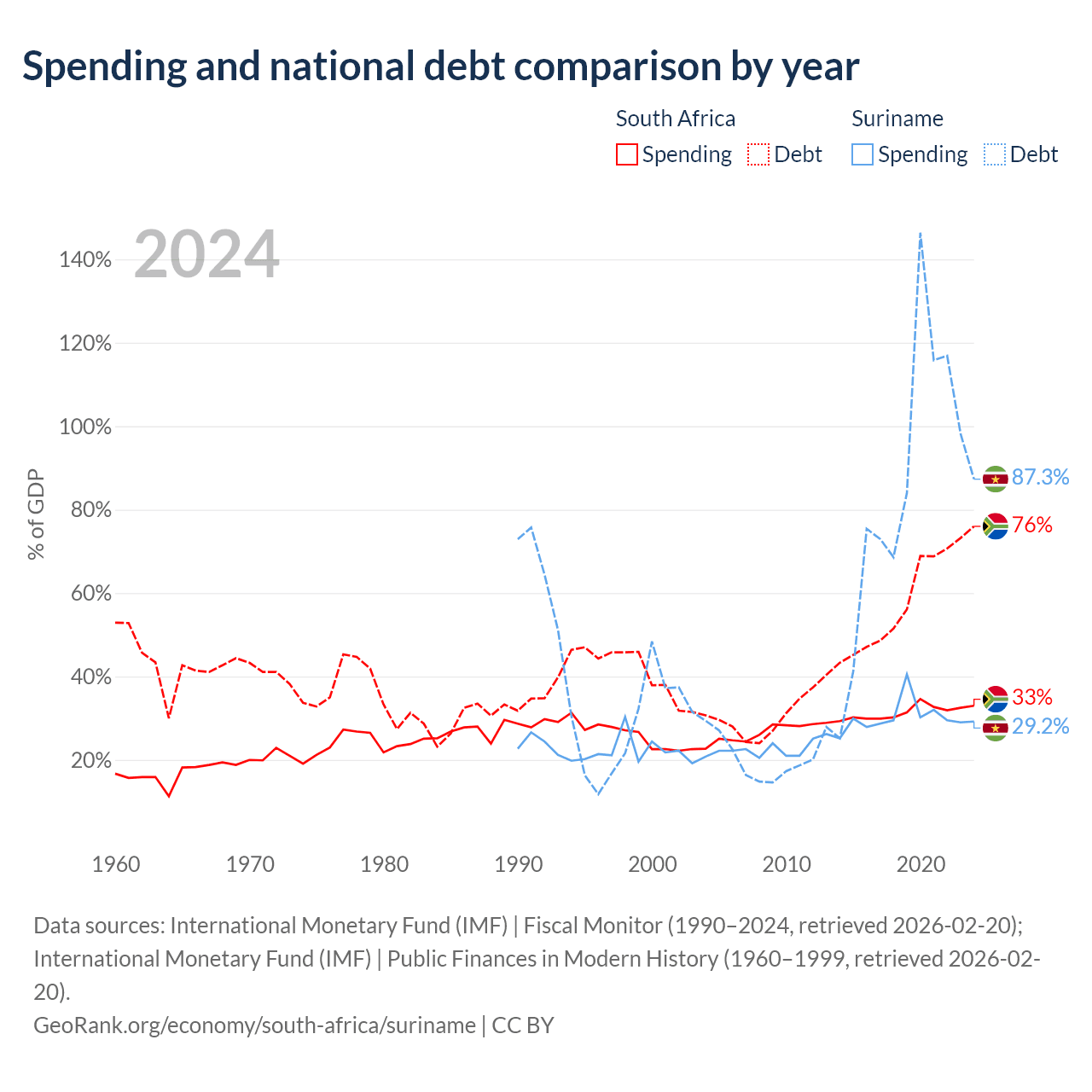 South Africa has $305B in government debt (76% of GDP), compared to $3.86B (87.3% of GDP) in Suriname.