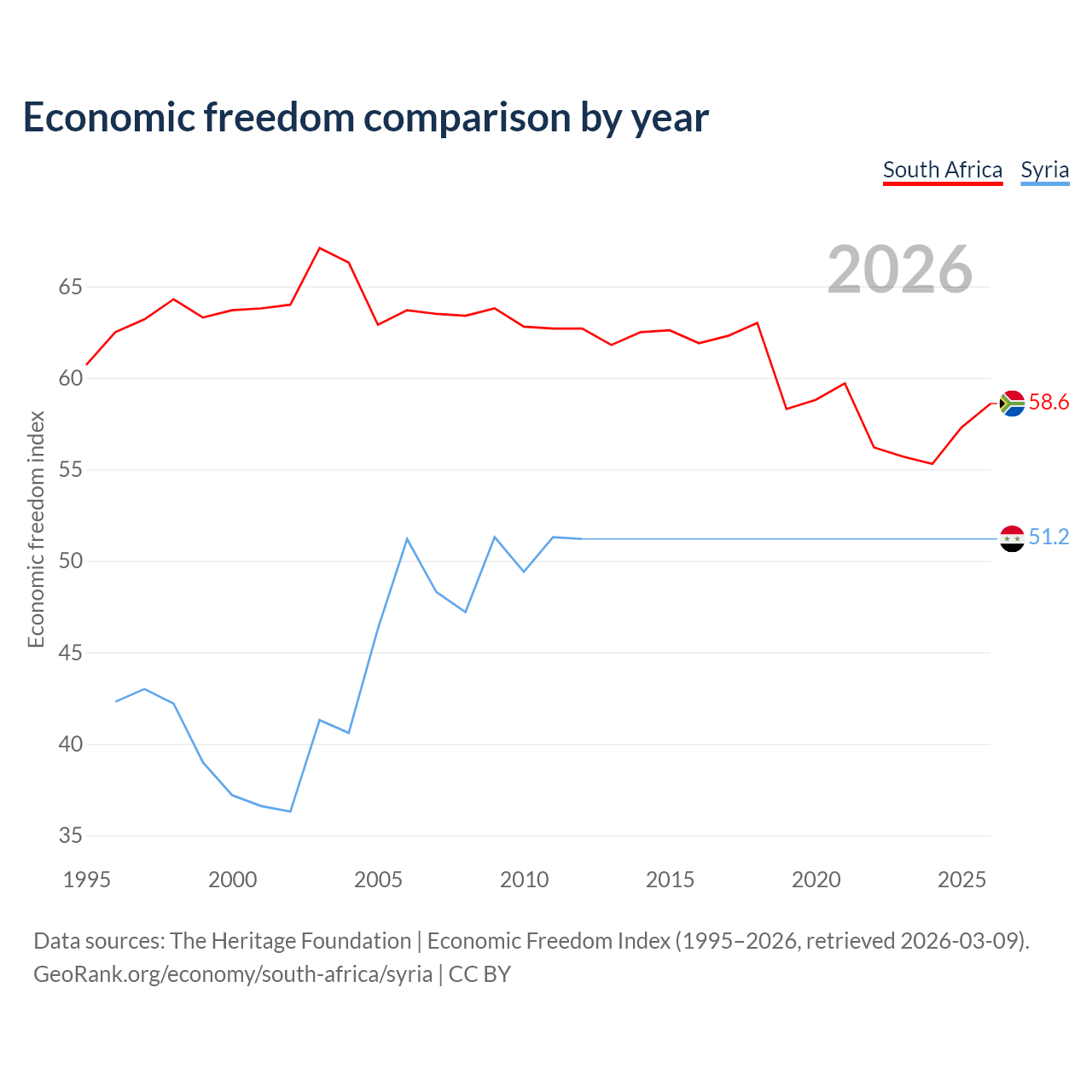 The Economic Freedom Index for South Africa is 58.6, ranking 110/197, compared to 51.2 for Syria, ranking 155/197. The chart above displays a comparison of annual changes in economic freedom indexes.
