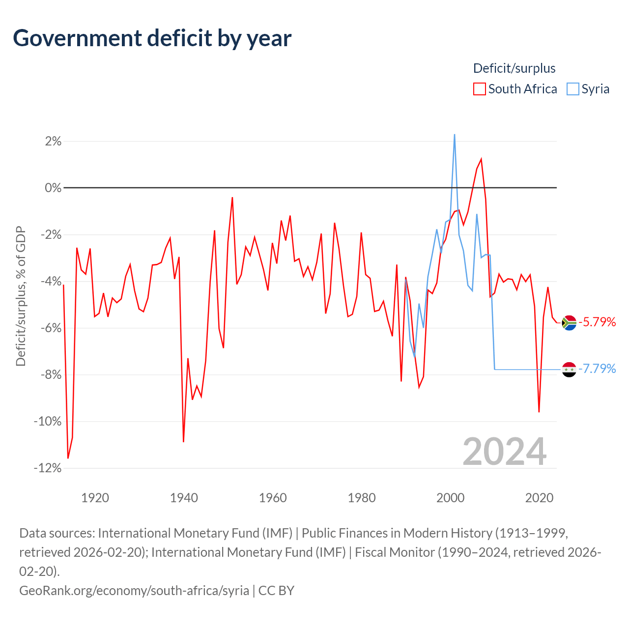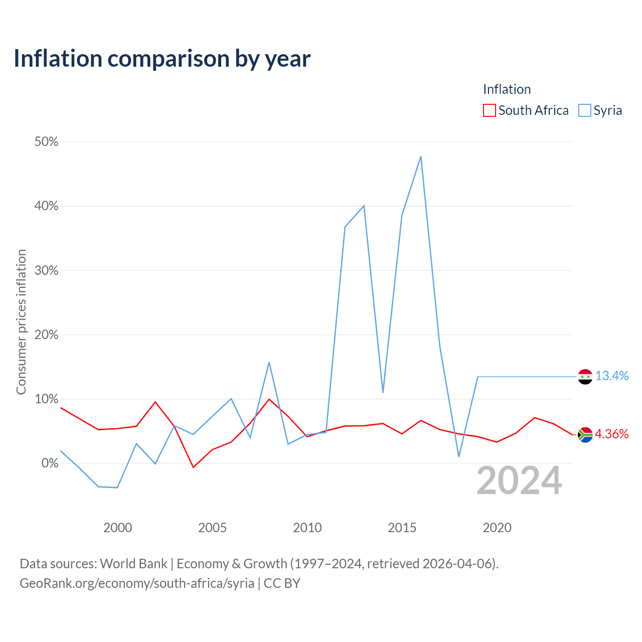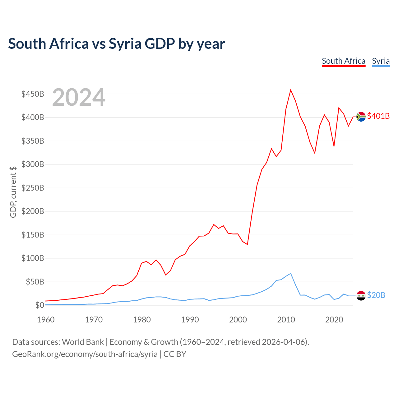 South Africa has a GDP of $401B compared to $20B for Syria, ranking 40/197 and 129/197 by economy size, respectively.