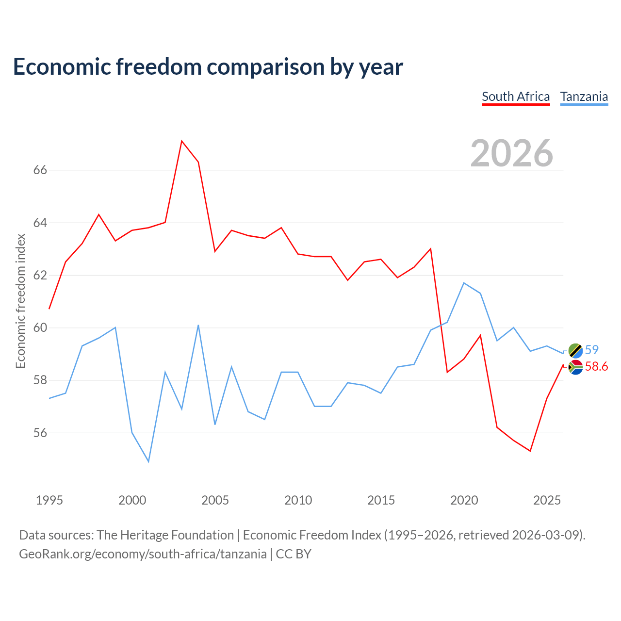 The Economic Freedom Index for South Africa is 58.6, ranking 110/197, compared to 59 for Tanzania, ranking 106/197. The chart above displays a comparison of annual changes in economic freedom indexes.