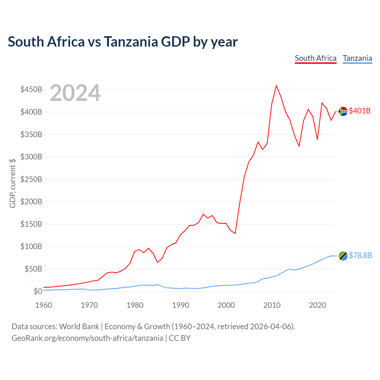 South Africa has a GDP of $401B compared to $78.8B for Tanzania, ranking 40/197 and 82/197 by economy size, respectively.