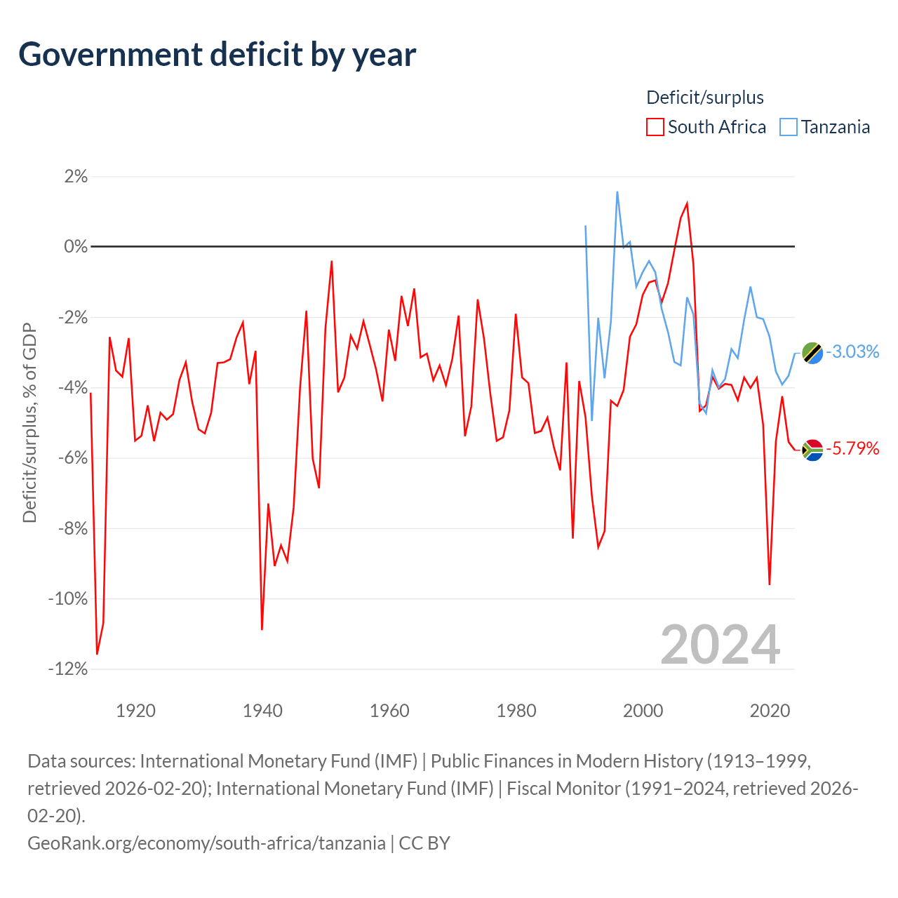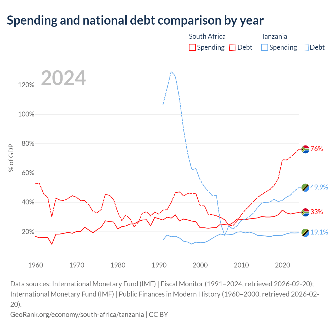 South Africa has $305B in government debt (76% of GDP), compared to $39.3B (49.9% of GDP) in Tanzania.