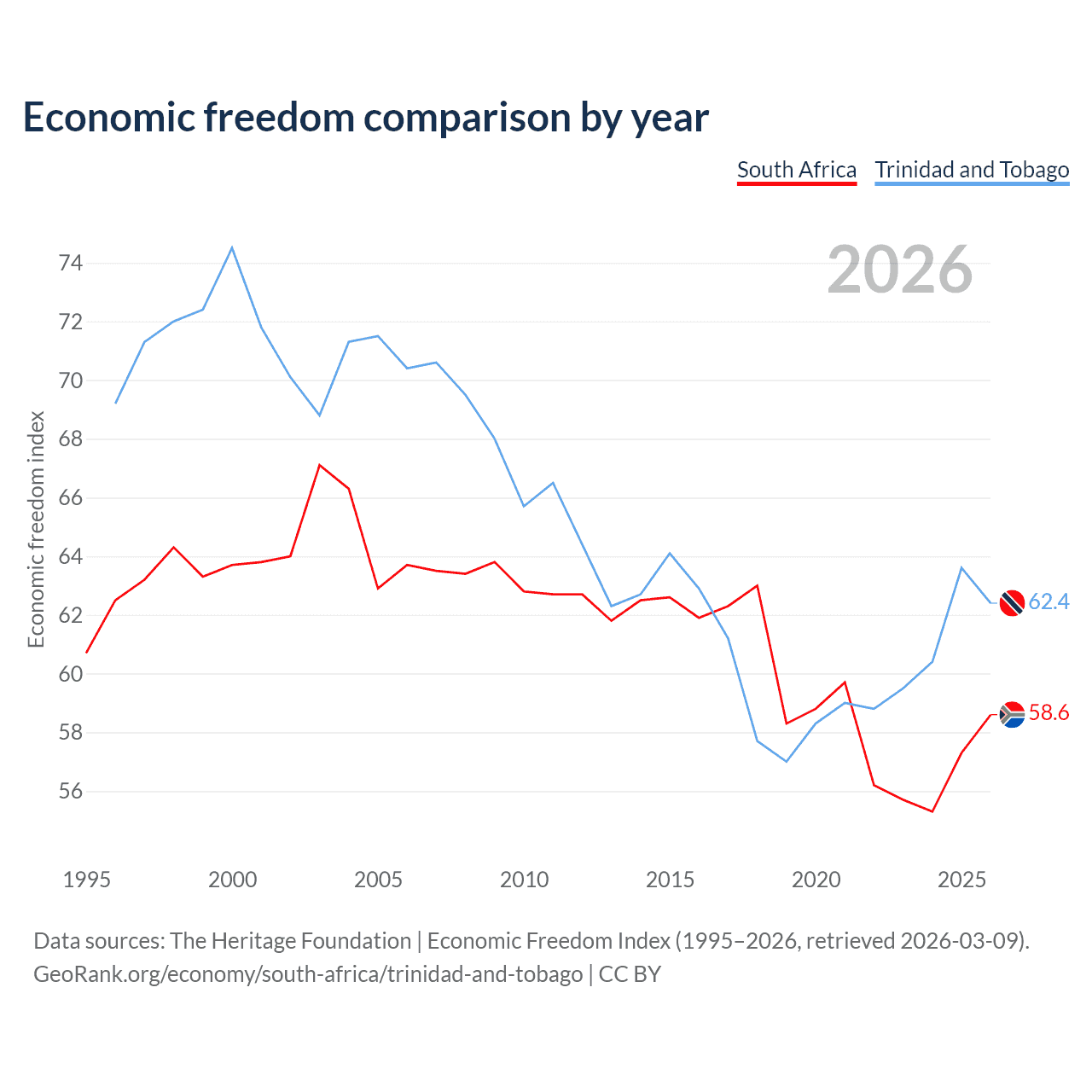 The Economic Freedom Index for South Africa is 58.6, ranking 110/197, compared to 62.4 for Trinidad and Tobago, ranking 87/197. The chart above displays a comparison of annual changes in economic freedom indexes.