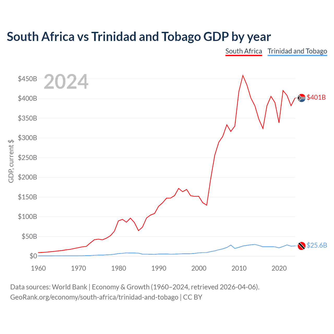 South Africa has a GDP of $401B compared to $25.6B for Trinidad and Tobago, ranking 40/197 and 115/197 by economy size, respectively.