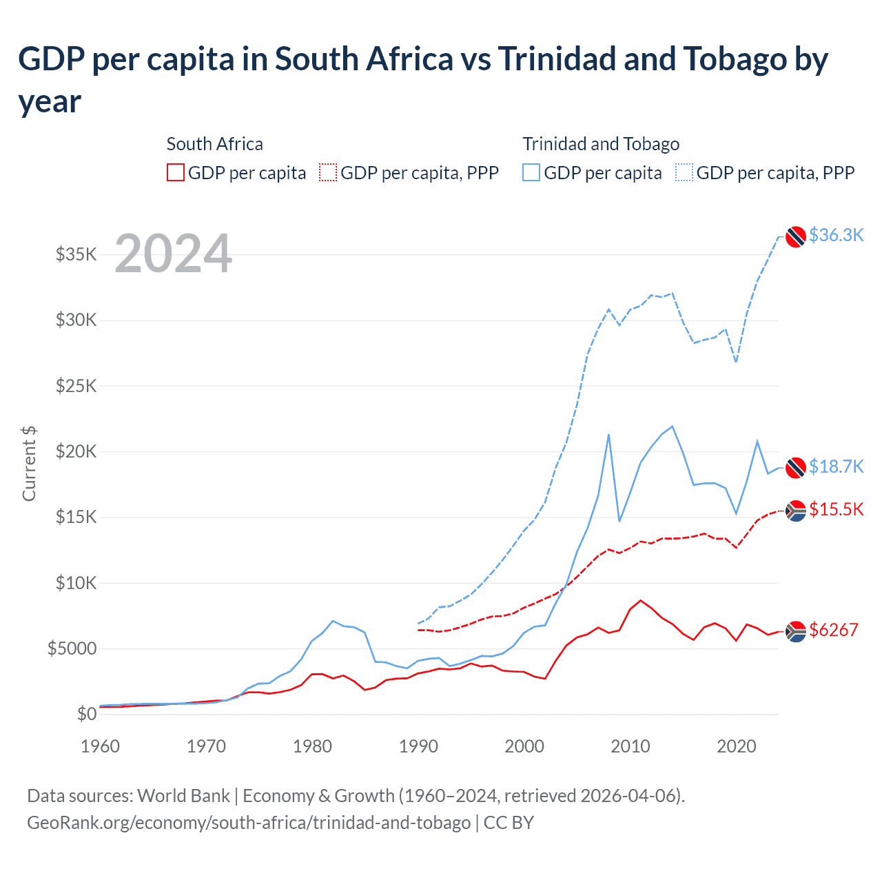 GDP per capita in South Africa vs Trinidad and Tobago by year
