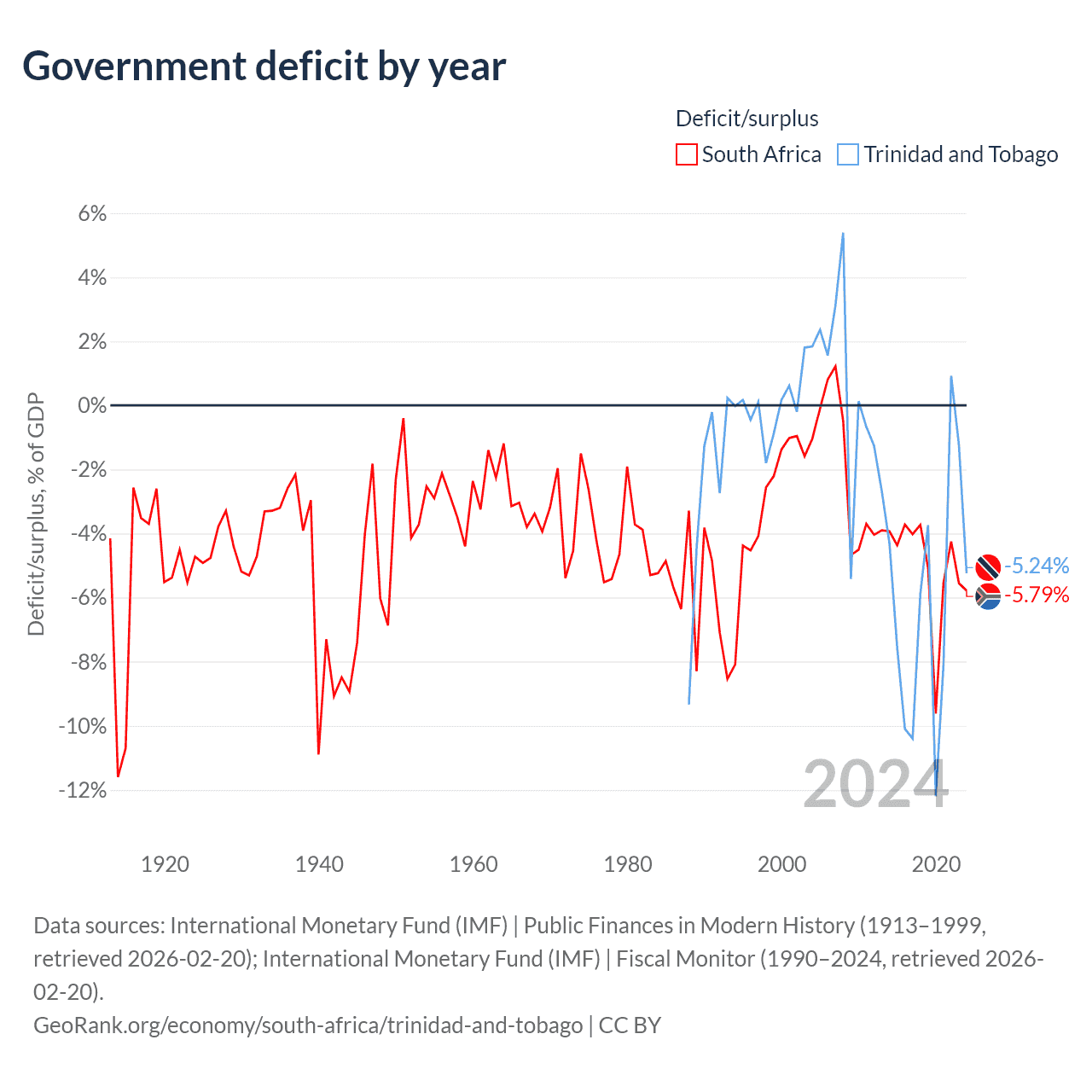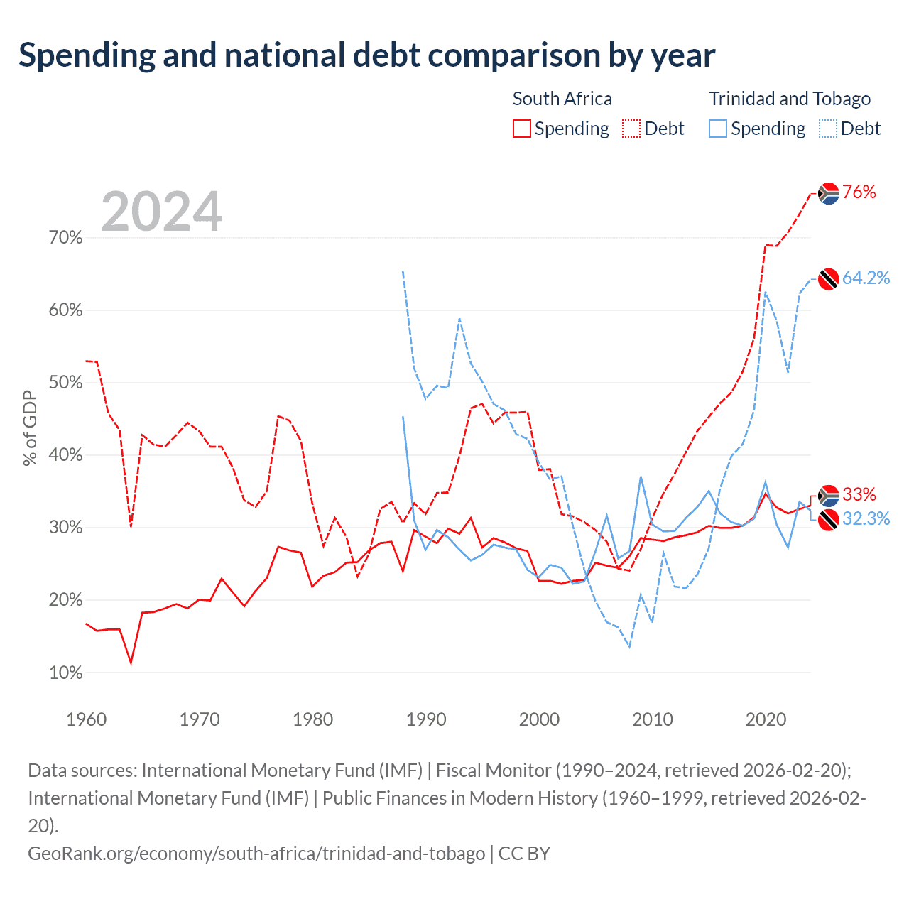 South Africa has $305B in government debt (76% of GDP), compared to $16.5B (64.2% of GDP) in Trinidad and Tobago.