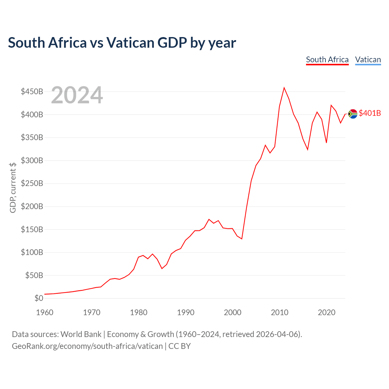 South Africa has a GDP of $401B compared to $19.8M for the Vatican, ranking 40/197 and 197/197 by economy size, respectively.