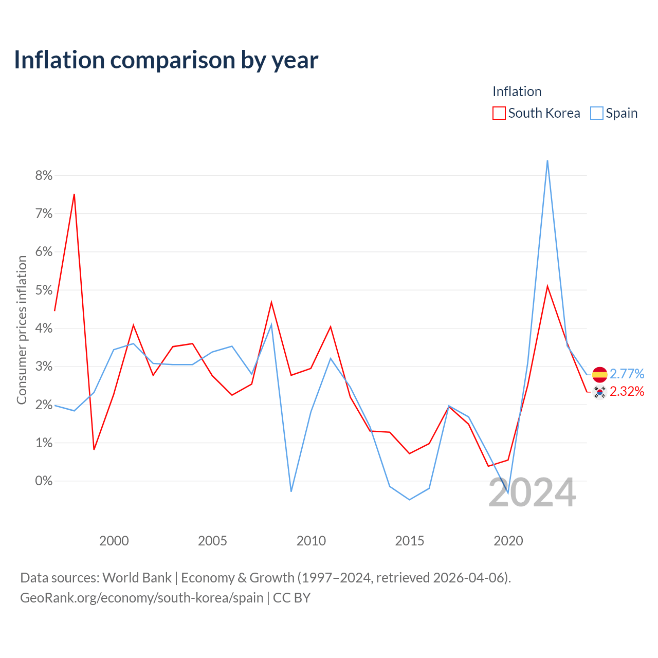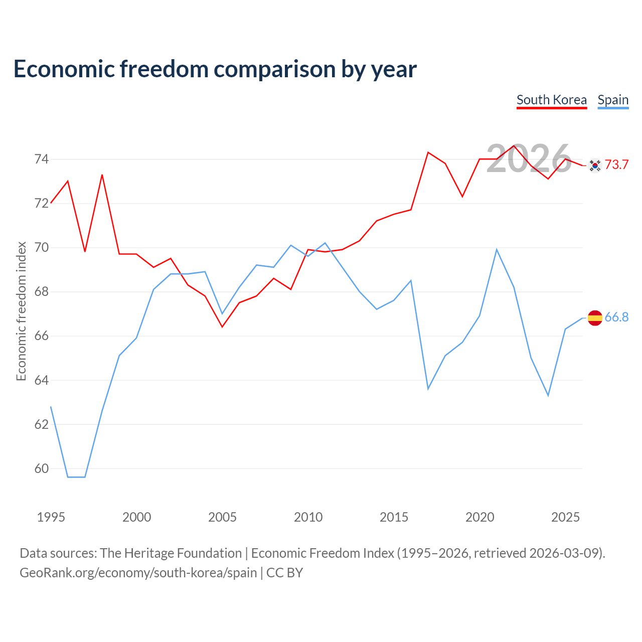 The Economic Freedom Index for South Korea is 73.7, ranking 24/197, compared to 66.8 for Spain, ranking 59/197. The chart above displays a comparison of annual changes in economic freedom indexes.