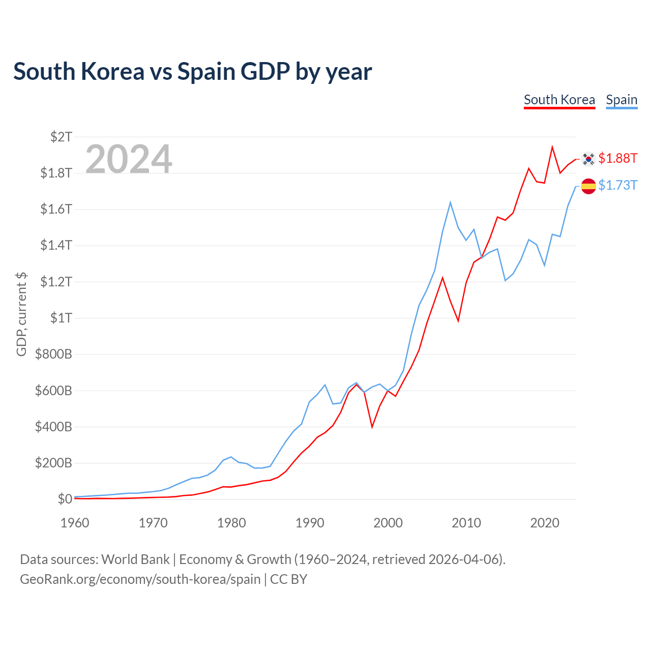 South Korea has a GDP of $1.88T compared to $1.73T for Spain, ranking 12/197 and 15/197 by economy size, respectively.