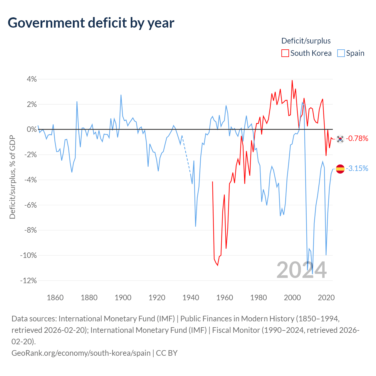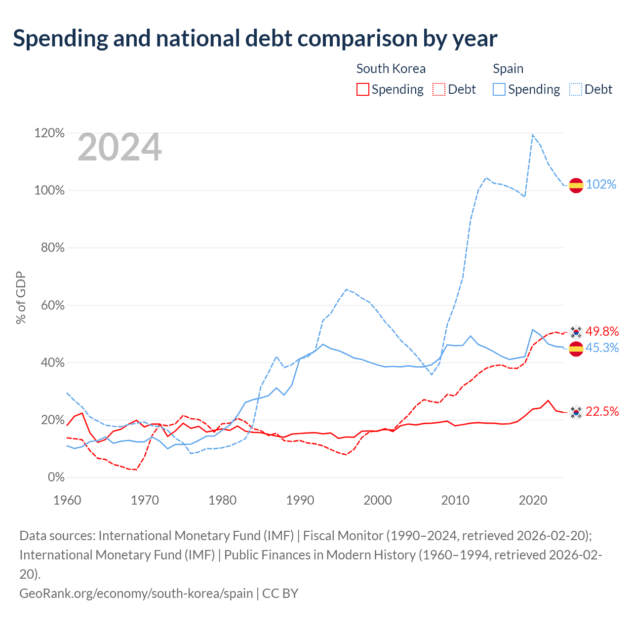 South Korea has $934B in government debt (49.8% of GDP), compared to $1.75T (101.6% of GDP) in Spain.