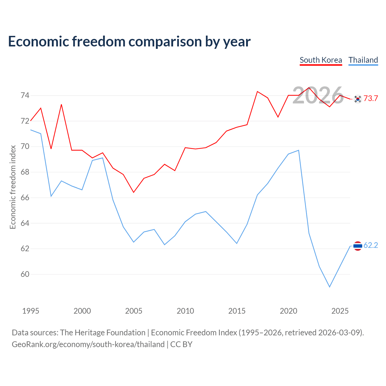 Data sources: The Heritage Foundation | Economic Freedom Index (1995–2026, retrieved 2026-03-09).