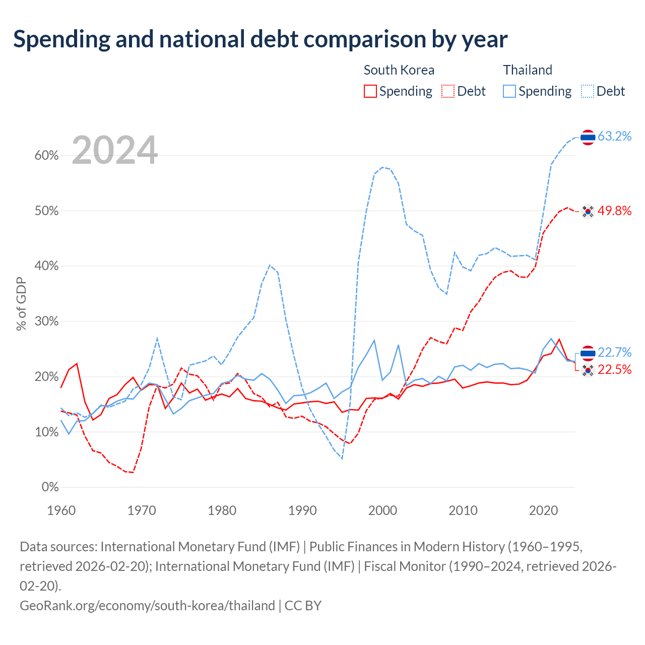 South Korea has $934B in government debt (49.8% of GDP), compared to $333B (63.2% of GDP) in Thailand.